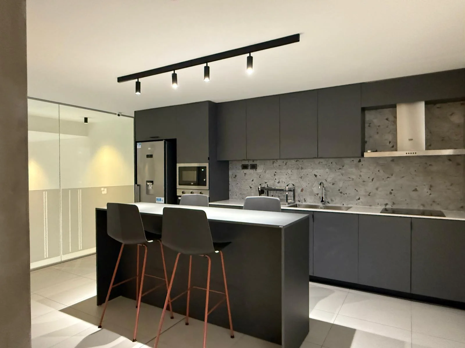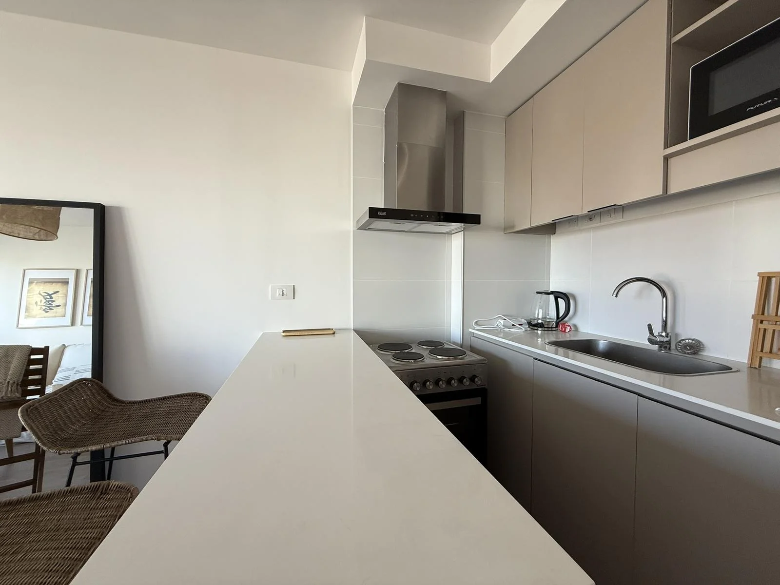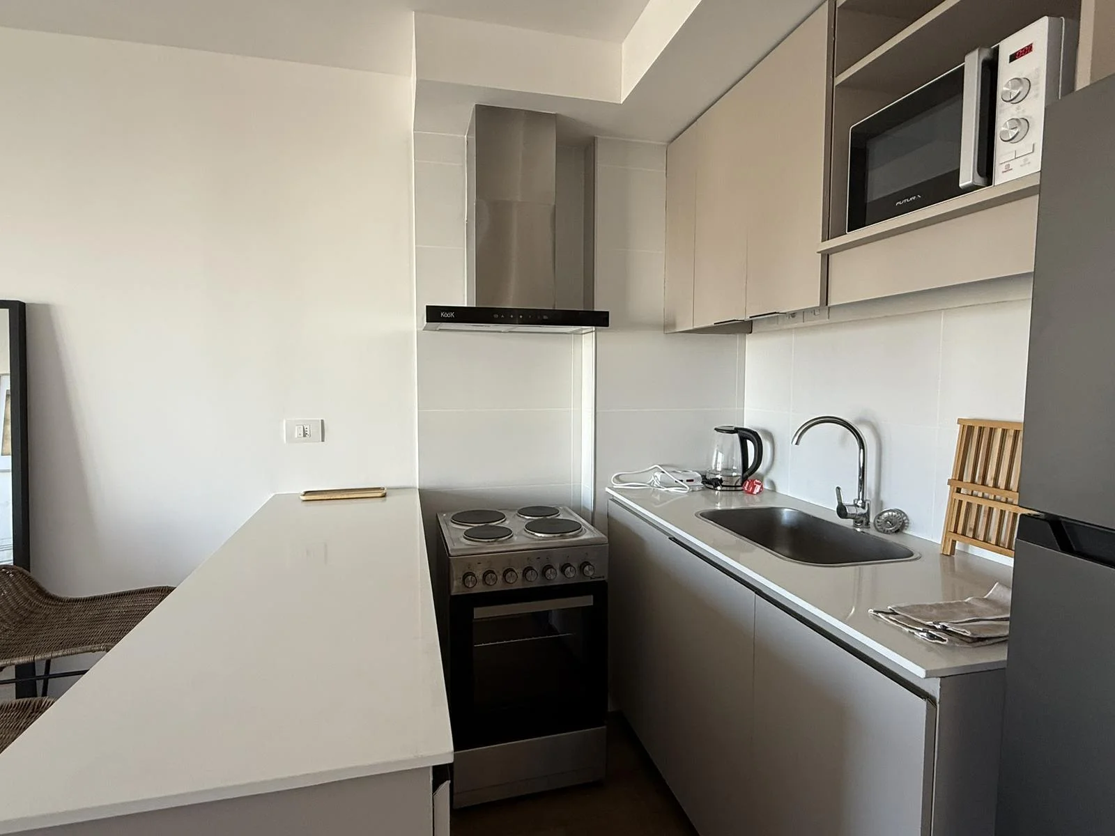Cocina integrada, con placar sobre y bajo mesada, anafe y campana.