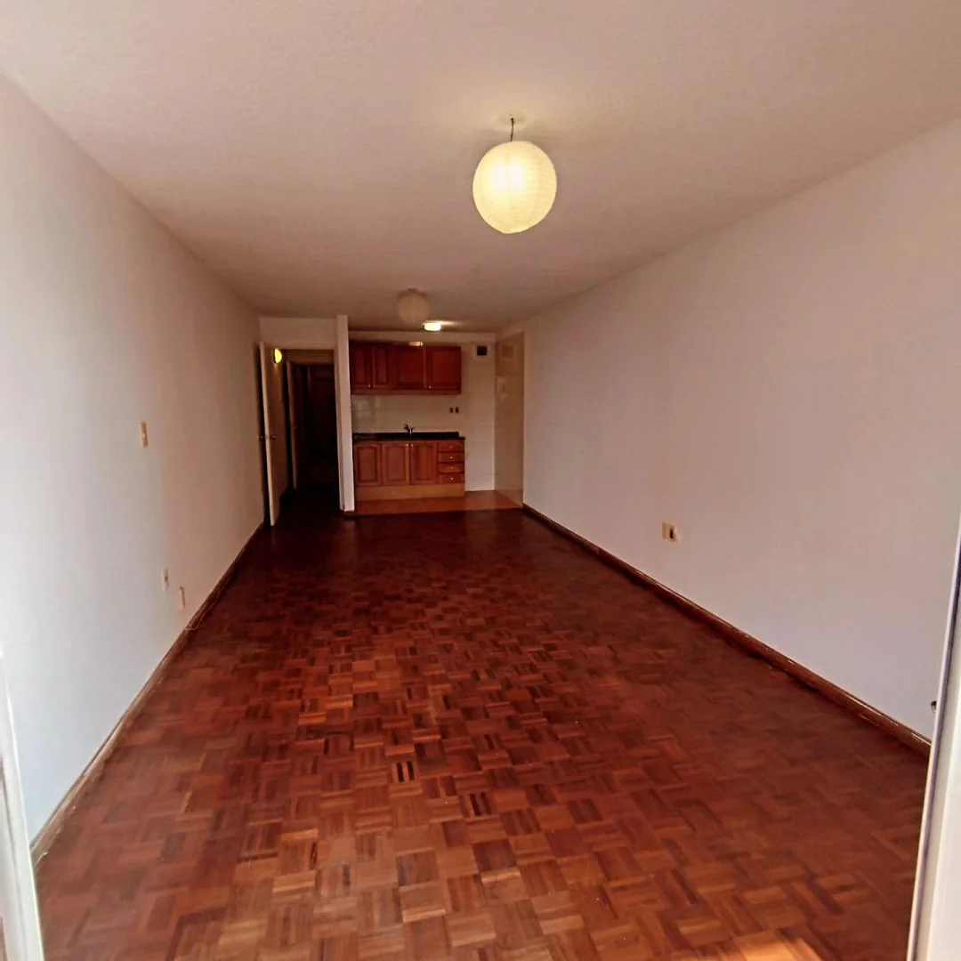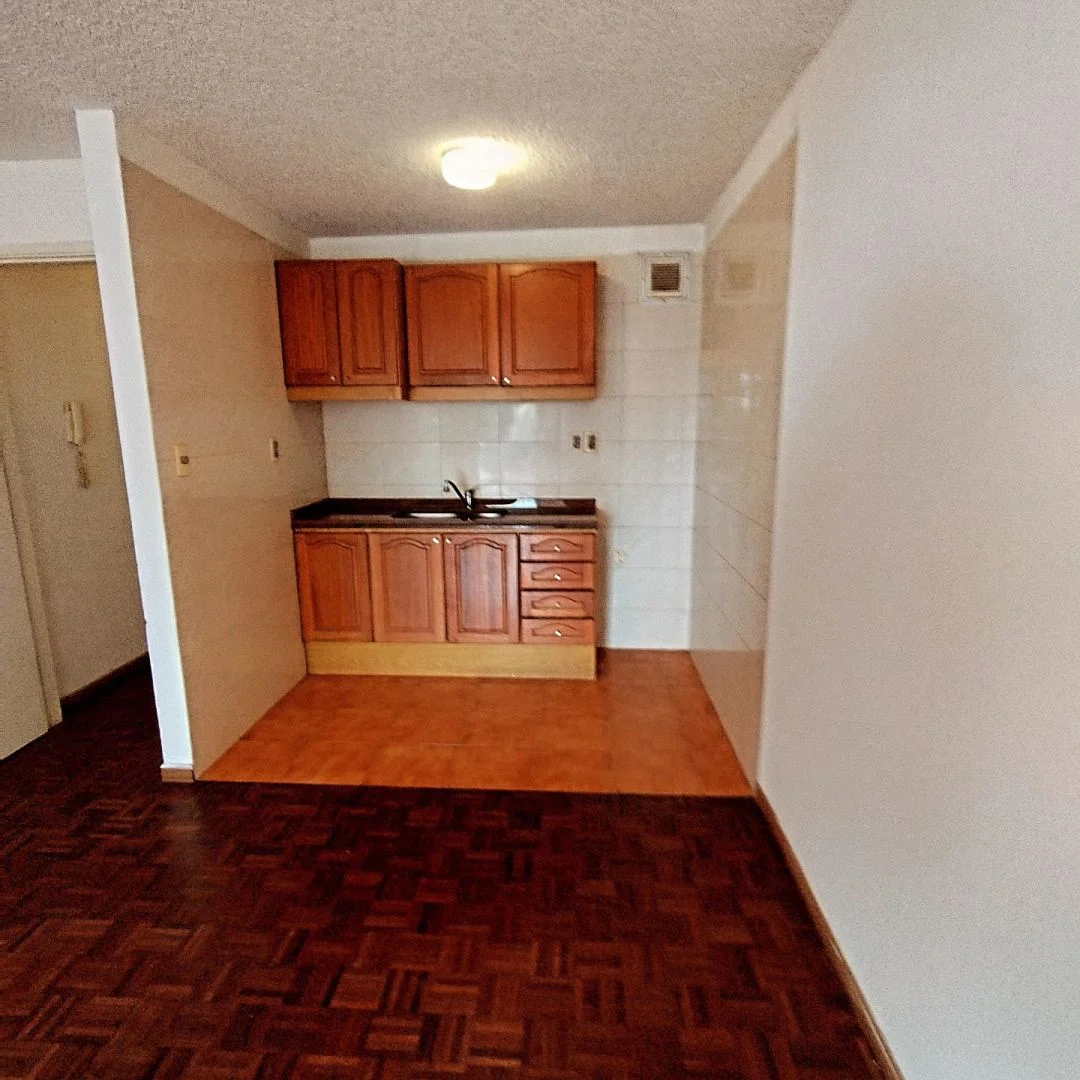 Monoambiente amplio y luminoso, con cocina integrada, con placares bajo y sobre mesada.