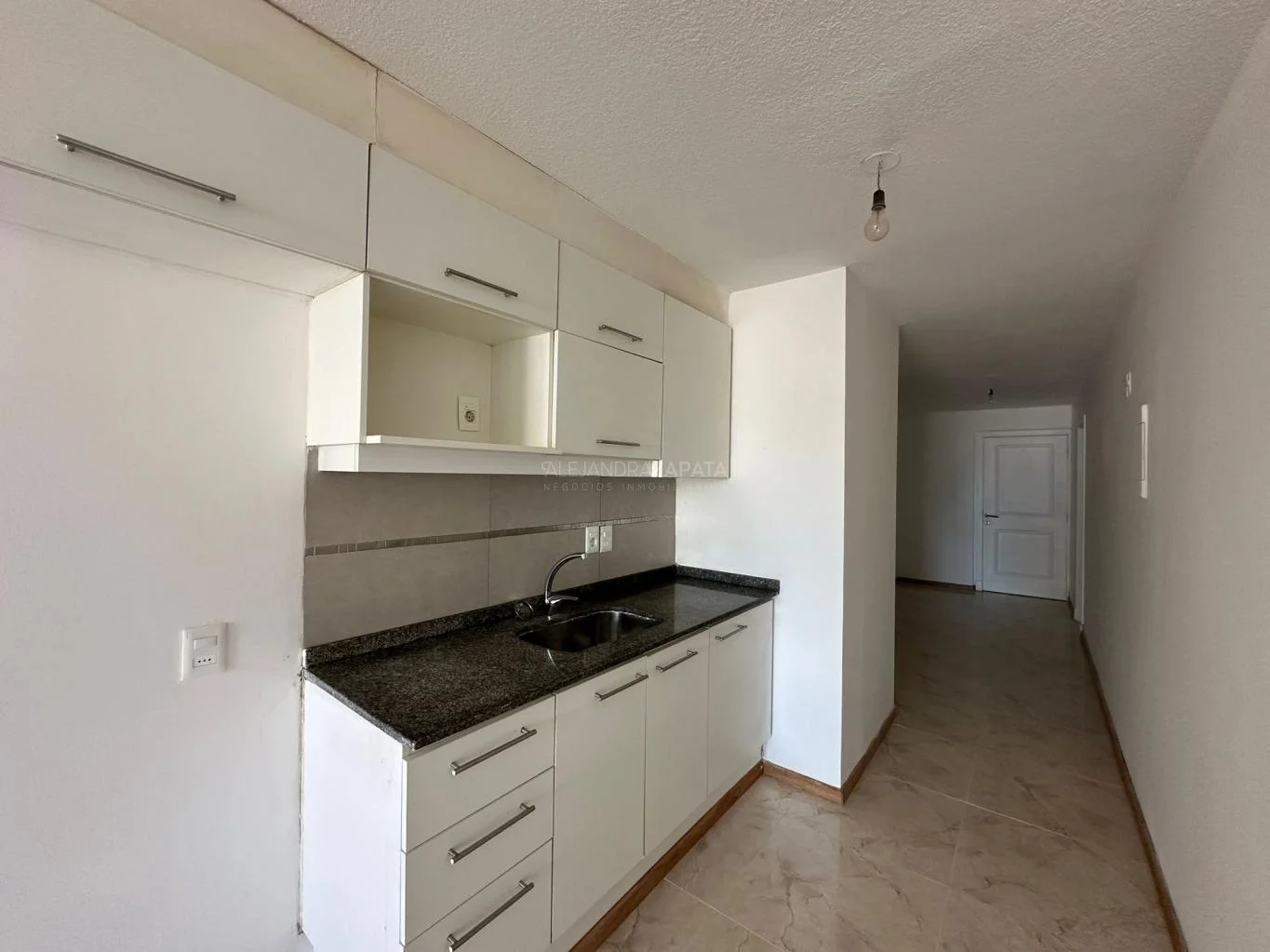 Cocina con placares sobre y bajo mesada, extractor instalado.