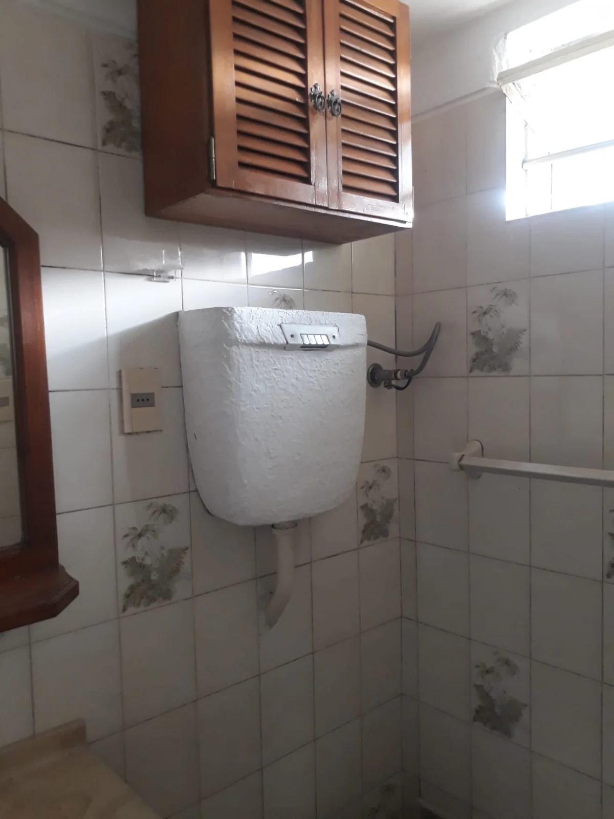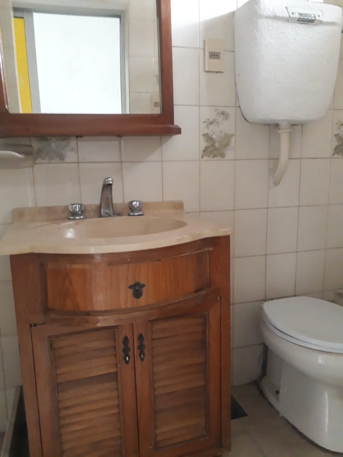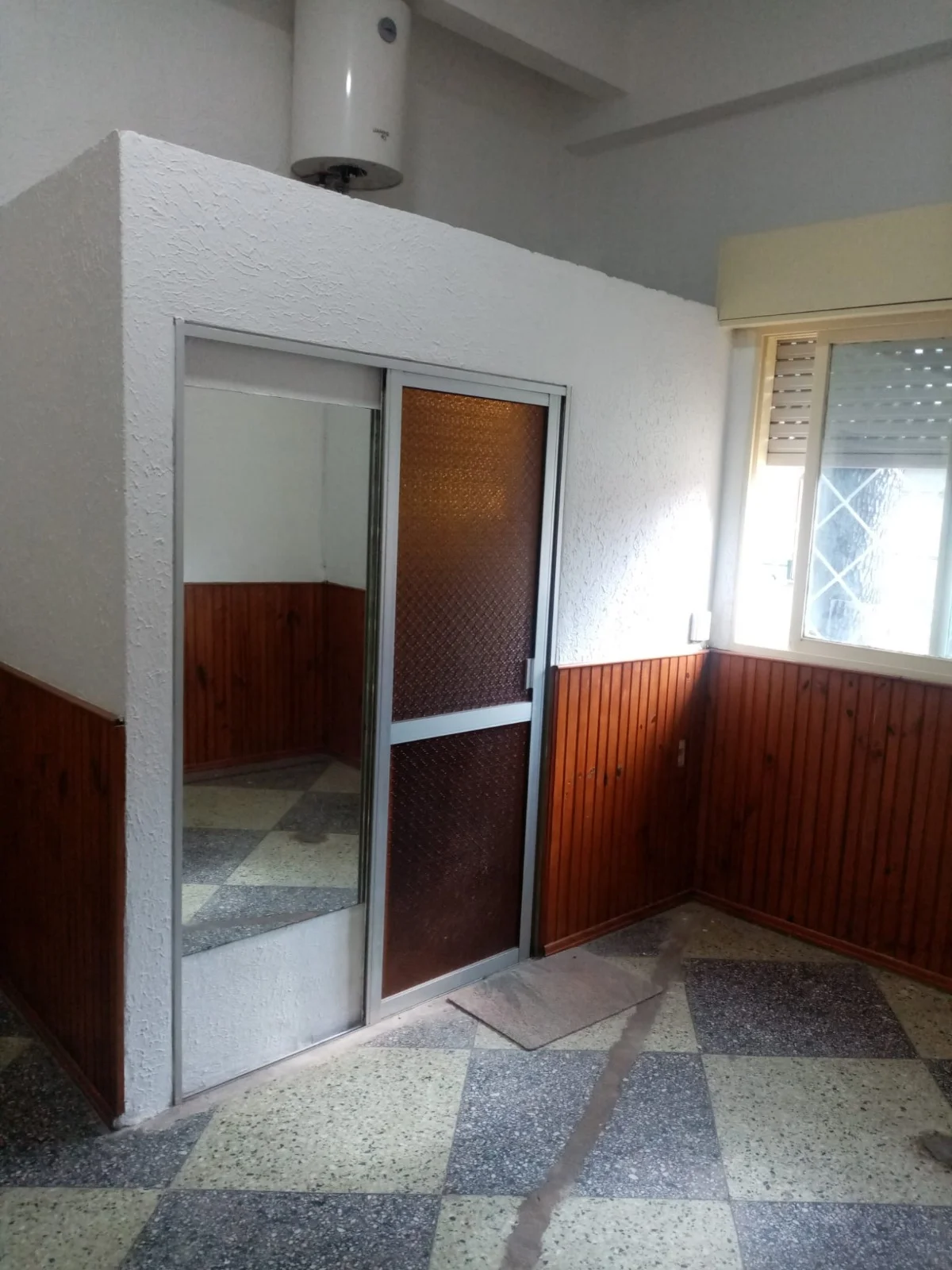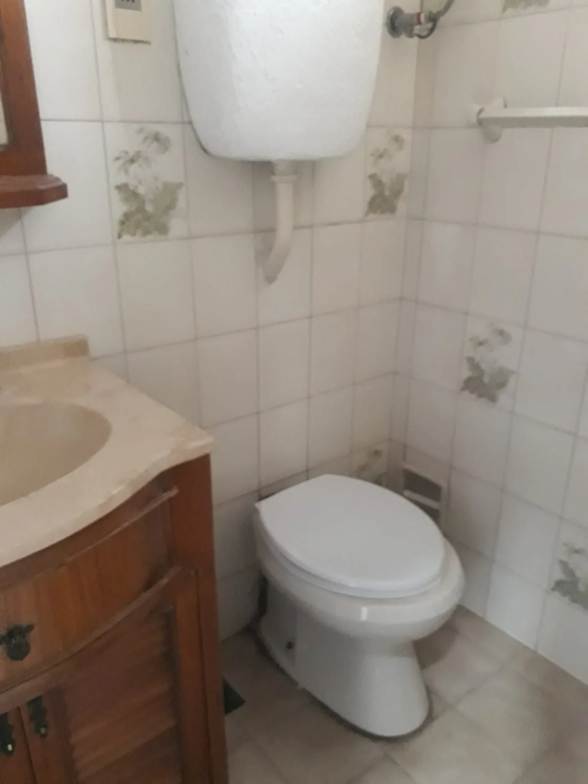 Baño completo con revestimiento en cerámica, ventilación natural y calefón.