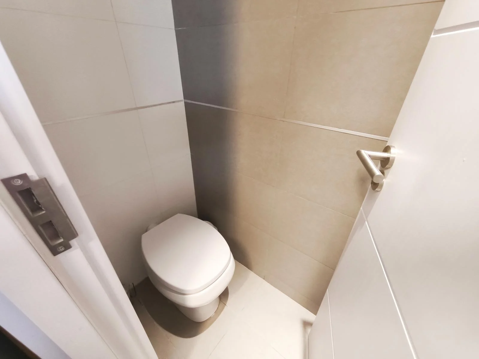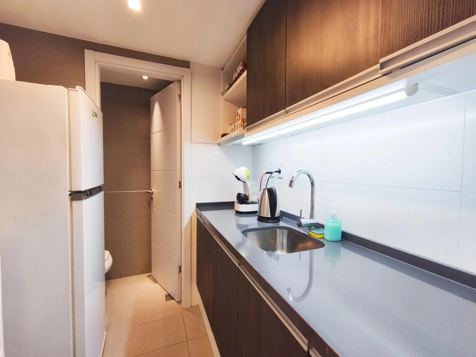 Kitchenette con baño social. Se entrega equipada con heladera, secamanos, mobiliarios aéreo y bajo mesada, calefón, equipamiento e iluminación.