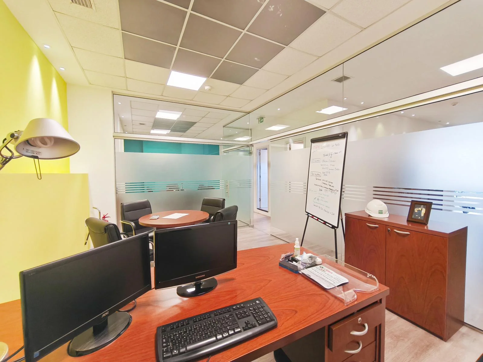 A continuación tenemos una zona de transición entre recepción, oficina gerencial y sala de reuniones con espacio para dos estaciones de trabajo y con divisiones de mamparas de cristal templado.