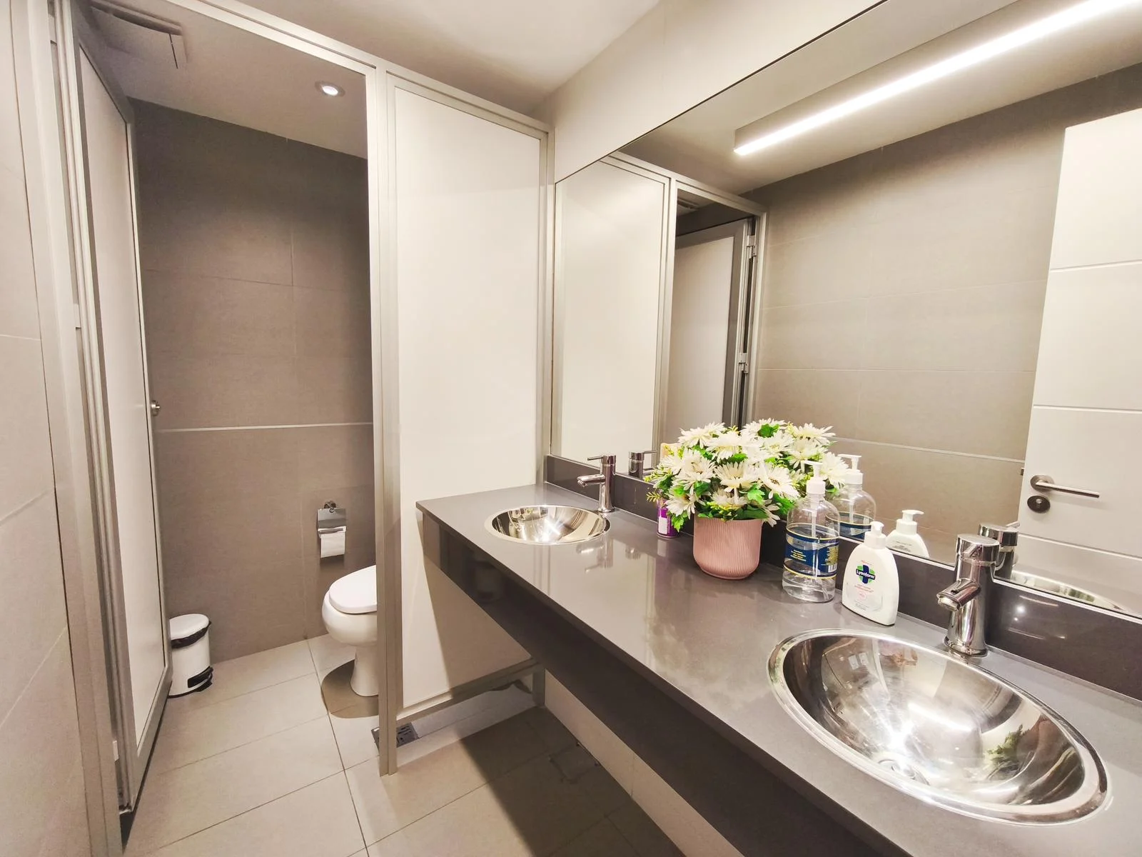 Cómodo baño completo con dos piletas, gran espejo, secamanos, extractor y dos papeleras.