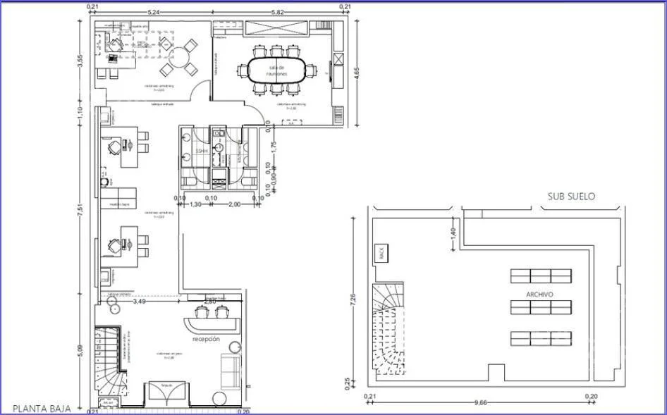 Planta baja cuenta con 115 m2 con la siguiente distribución: recepción, puestos de trabajo, oficina ejecutiva, sala de Reuniones, 2 baños y cocina.