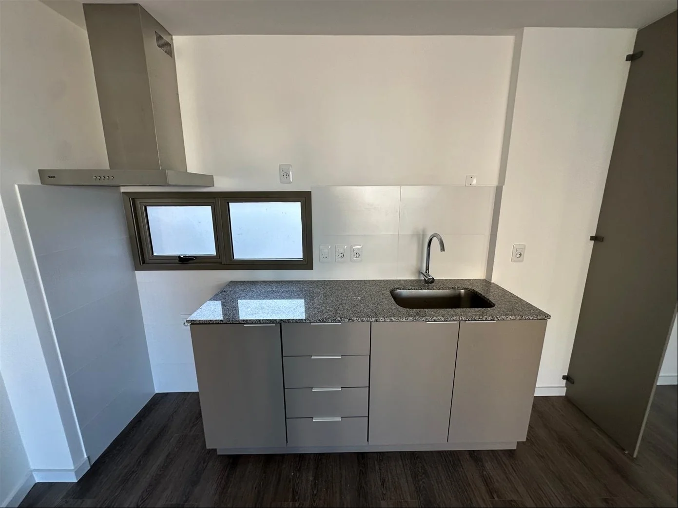 Living comedor con salida a terraza, cocina integrada con muebles aéreos y bajo mesada