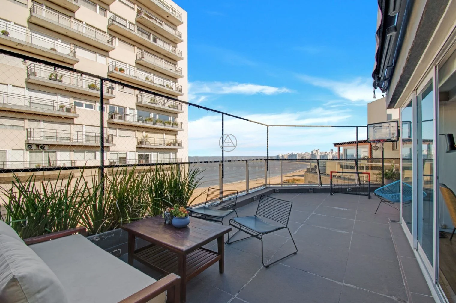 Living comedor apaisado con salida a Gran Terraza con Vista Rambla y Mar , Parrillero techado!