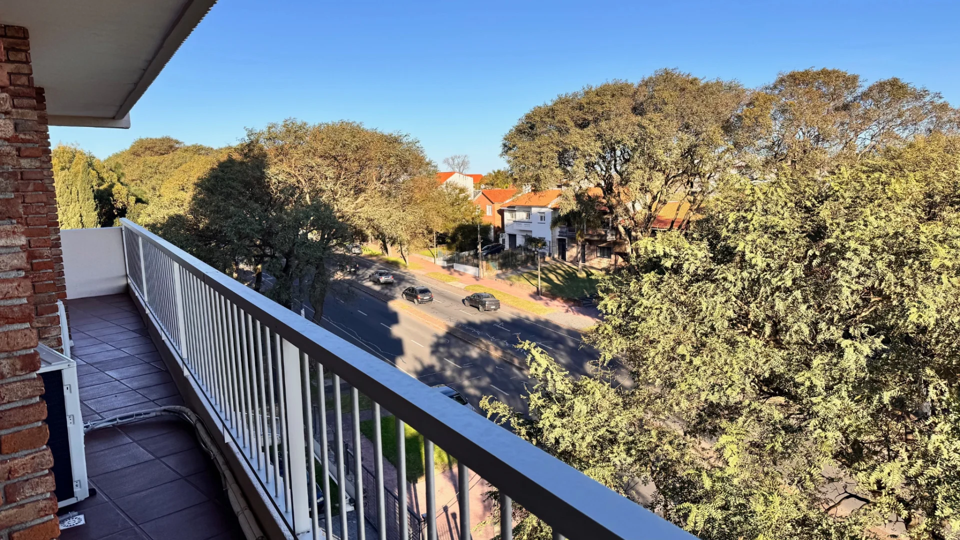 La distribución incluye un elegante hall de entrada que conduce a un generoso living-comedor, con acceso directo a la gran terraza que abarca todo el frente del edificio. La cocina es amplia y luminosa, equipada con terraza lavadero y un servicio completo que puede adaptarse como escritorio. Dispone de tres dormitorios con placares y dos baños completos.
