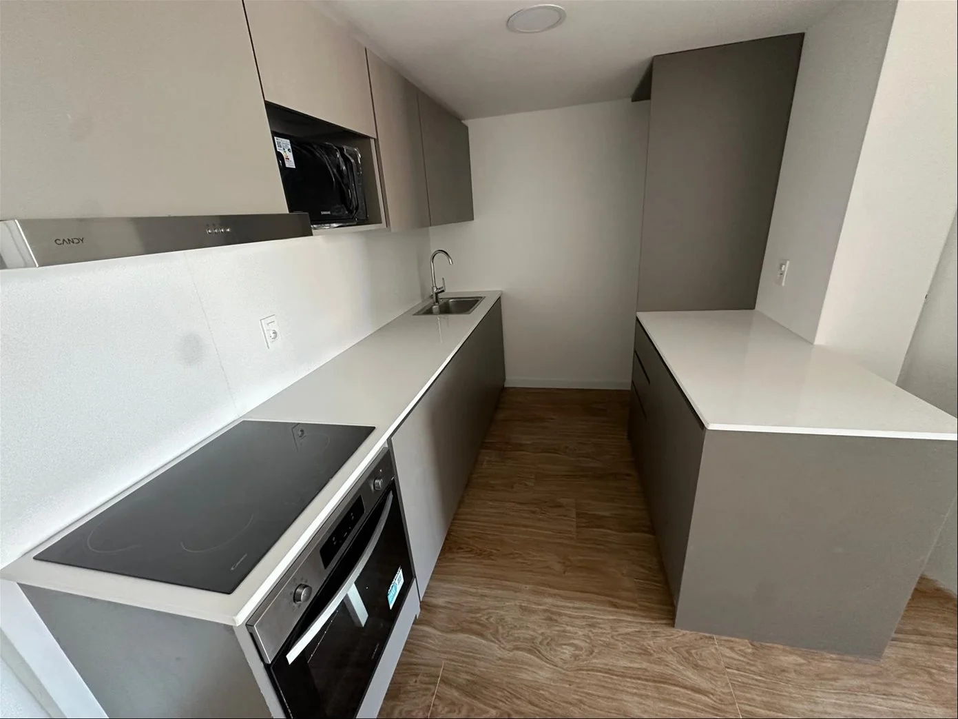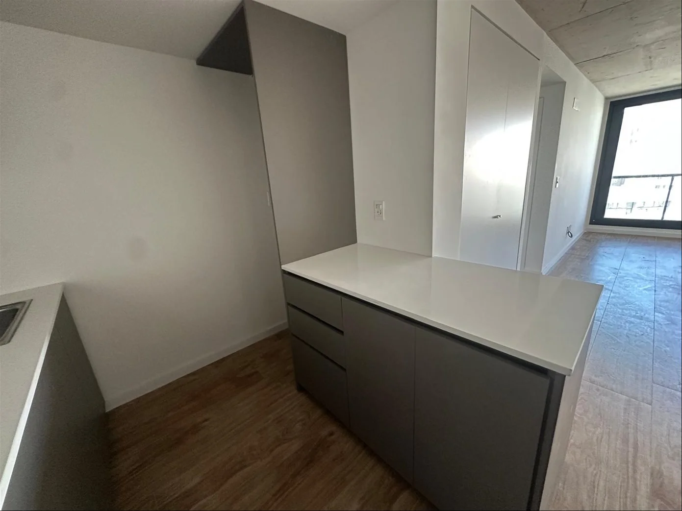 Cocina integrada, dispone de mesada desayunadora, muebles aéreos y bajo mesada
