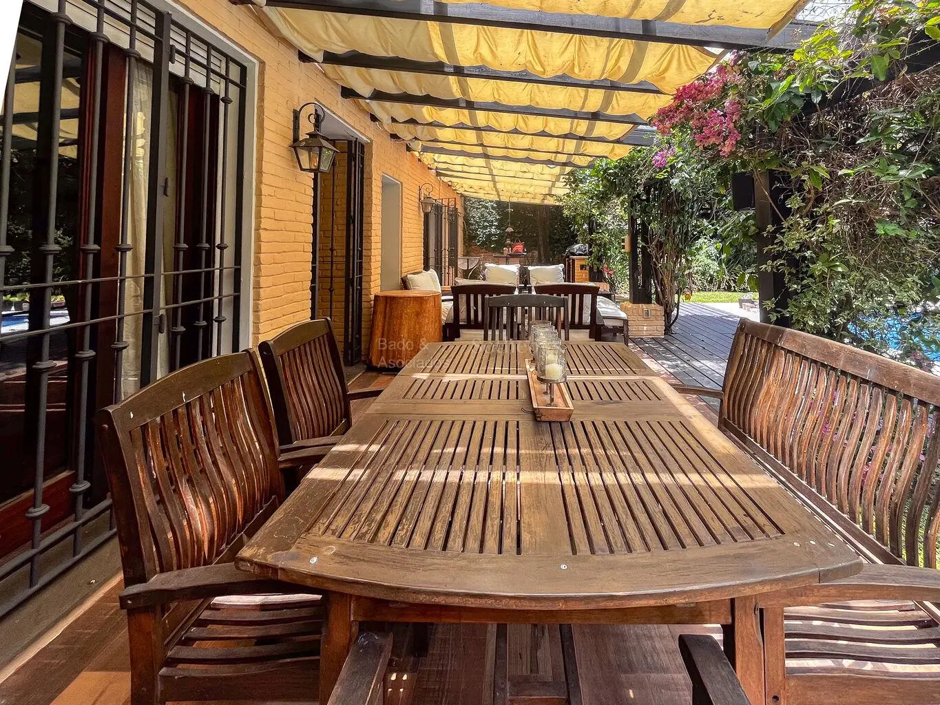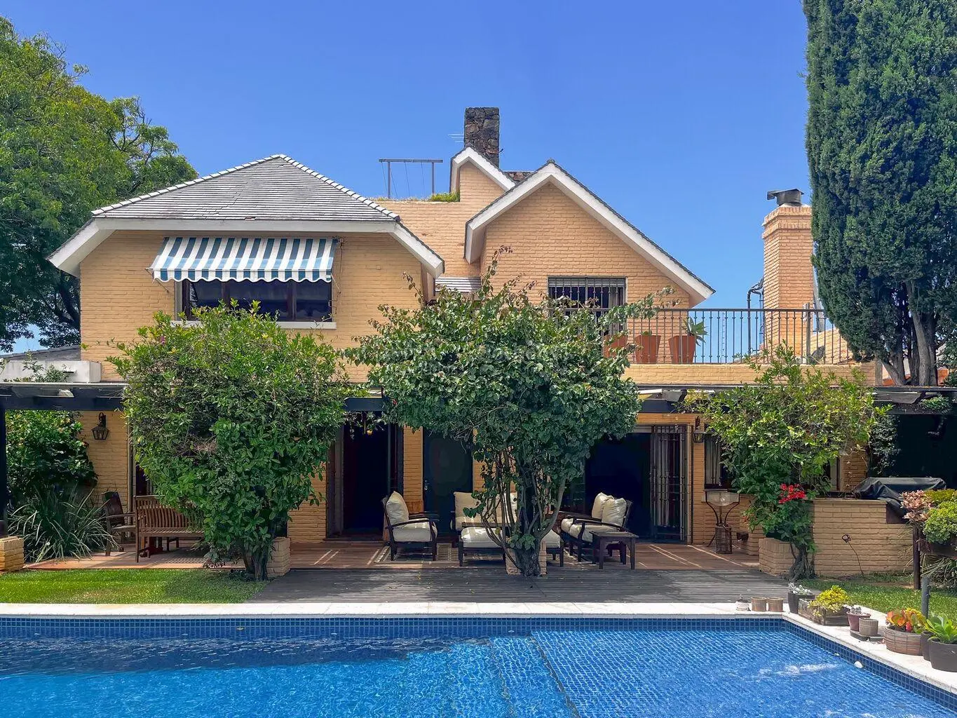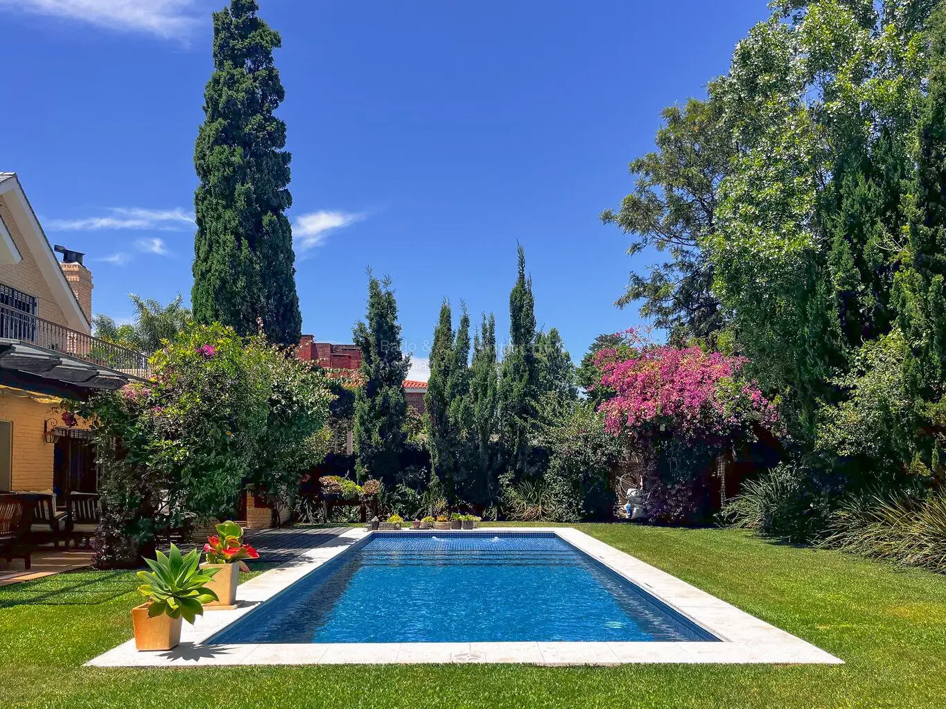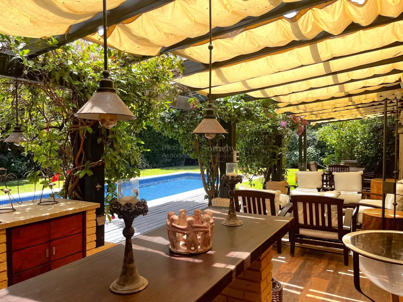 Hacia el jardín, una terraza pergolada invita al descanso y a la vida exterior, enmarcando la piscina, protagonista de un entorno verde y sereno. La excelente orientación asegura luminosidad natural durante todo el día.