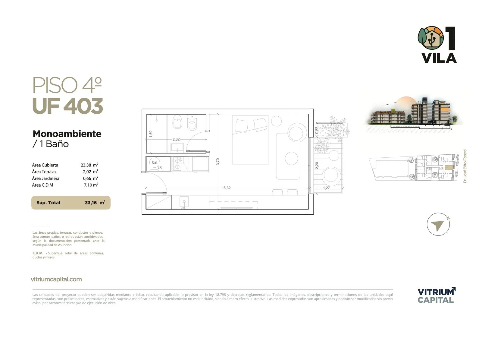 REVENTA - Unidad ubicada al frente sobre Brito Foresti, con una superficie total de 33 m2, con 23.38 m2 de superficie propia + 2m2 de terraza.
