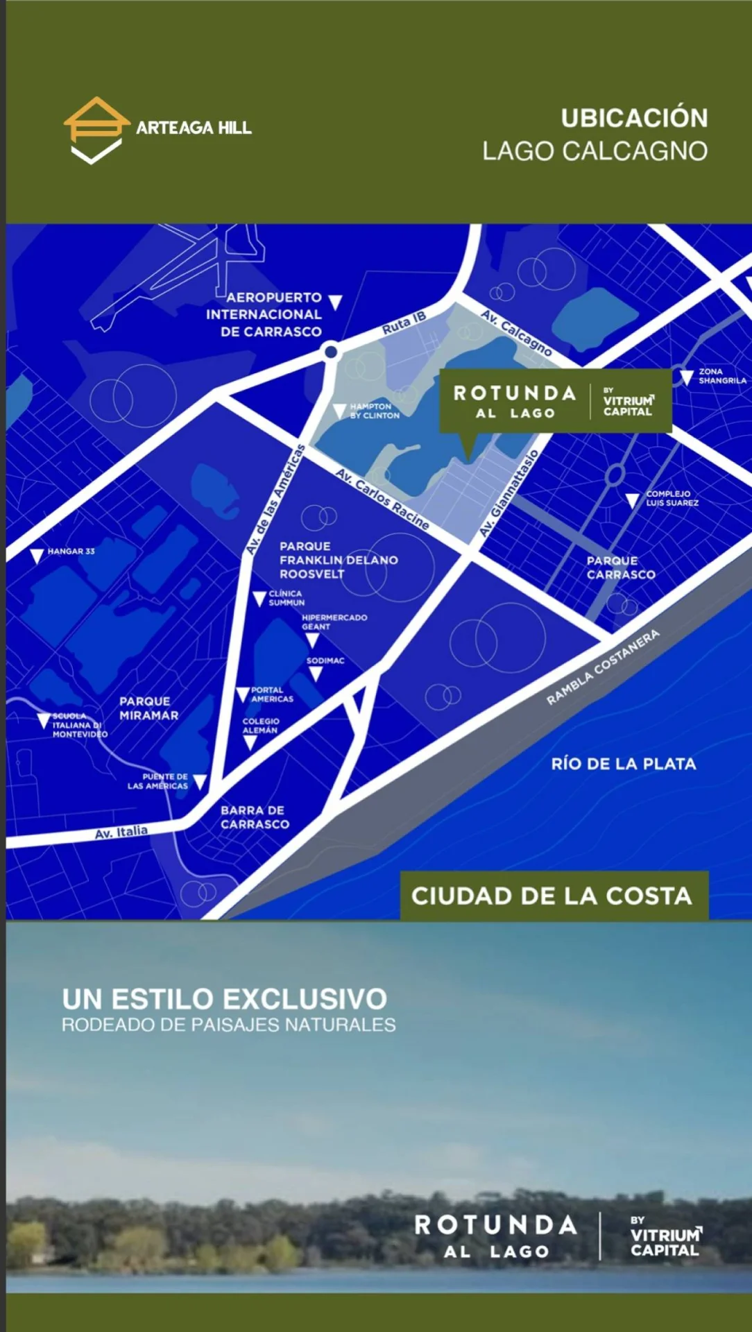 Arteaga Hill Propiedades presenta Rotunda al Lago, un emprendimiento de primer nivel en obra con entrega estimada agosto 2027, ubicado sobre Presidente Kennedy entre Glicina y Crisantemo, frente al Lago Calcagno, en la codiciada zona de Parque Carrasco / Ciudad de la Costa.