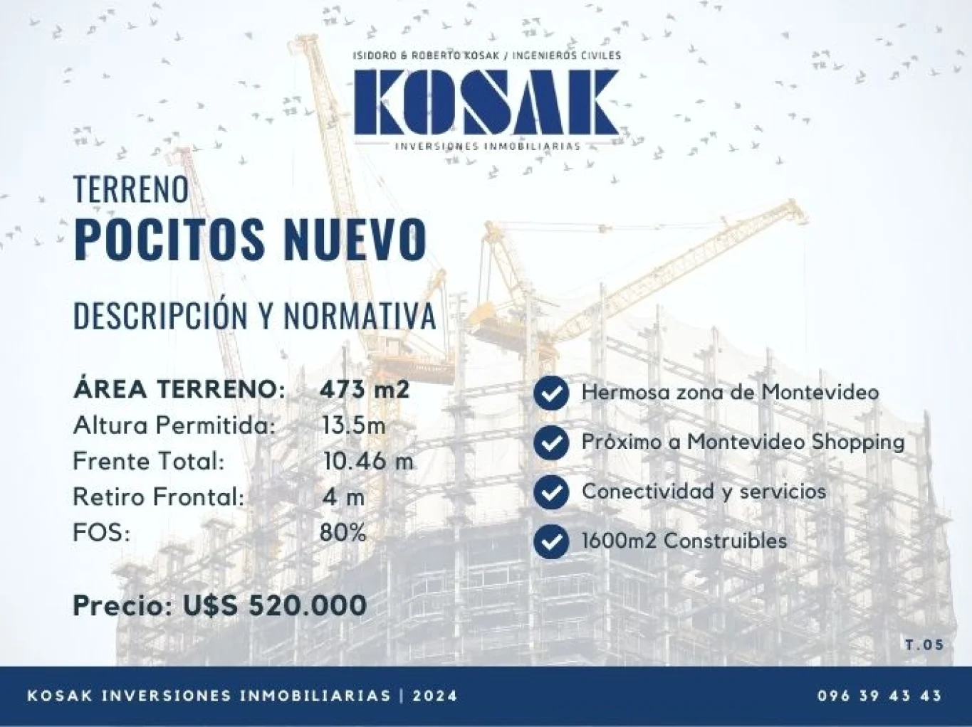 KOSAK INVERSIONES INMOBILIARIAS - TERRENOS Terreno en Pocitos Nuevo próximo al Montevideo Shopping, cercano a la Rambla, próximo al parque de la amistad. Espectacular zona para nuevos desarrollos. A 3 cuadras de Rivera y 2 cuadras de 26 de Marzo. Área: 473m2 Altura Permitida: 13.5m (PB + 5p) Retiro Frontal: 4m FOS: 80% Frente: 10.46m Por consultas comunicarse con Arq. Valentina Kosak - ***