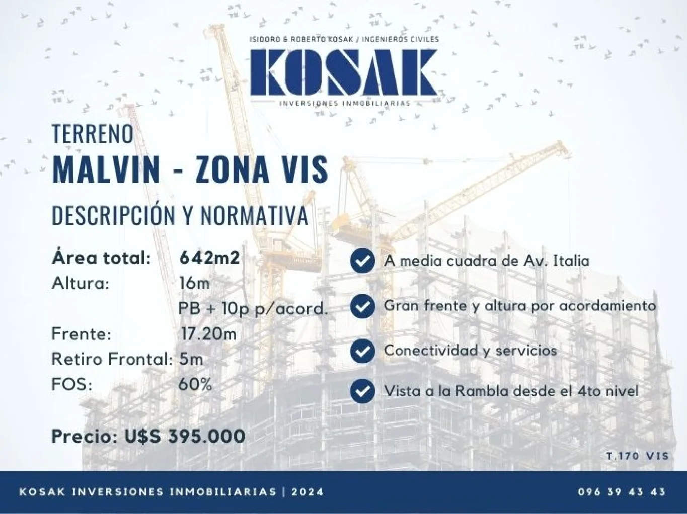 KOSAK INVERSIONES - TERRENOS Terreno VIS en Malvín. A media cuadra de Av. Italia. Por su altimetría cuenta con vista a la Rambla desde el cuarto nivel aproximadamente. Posibilidad de edificar 10 pisos por acordamiento. Área total: 642m2 Altura: PB + 10 pisos por acordamiento (16m por normativa) Frente: 17.20m Retiro Frontal: 5m FOS: 60% Opción de sumar padrón lindero. Por consultas comunicarse con Arq. Valentina Kosak - ***