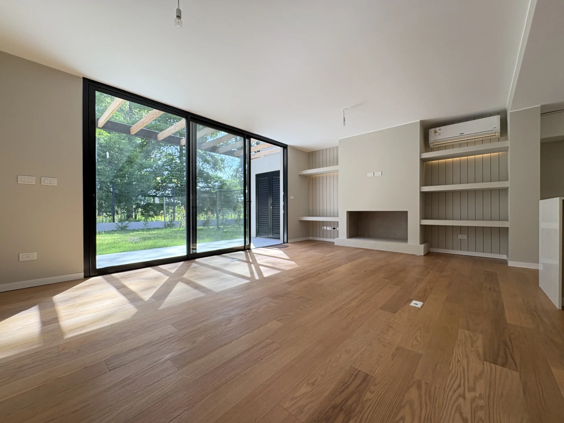 Living comedor amplio con estufa a leña y ventanales que conectan con pergola con parrillero. Muy lindo jardin.