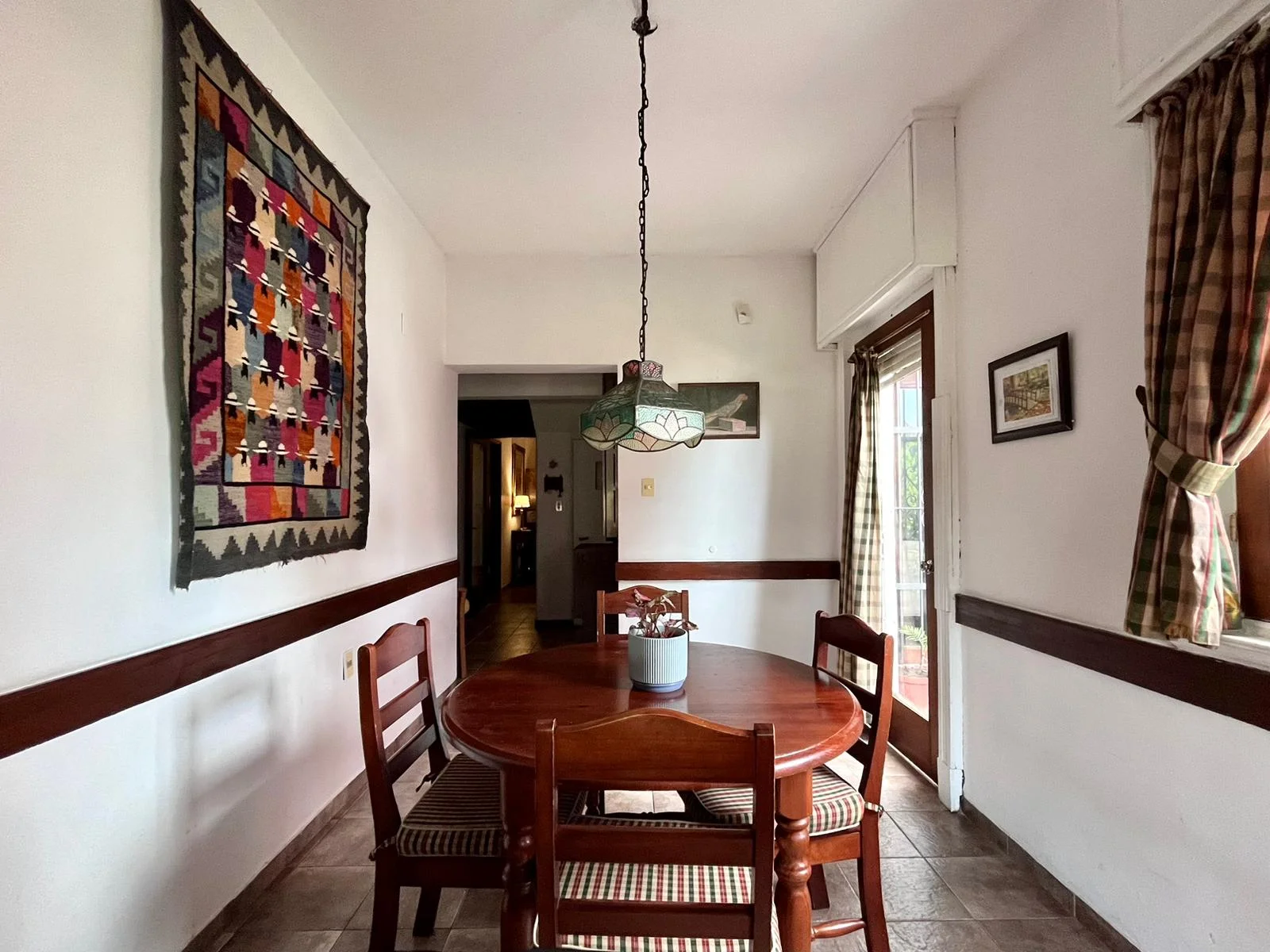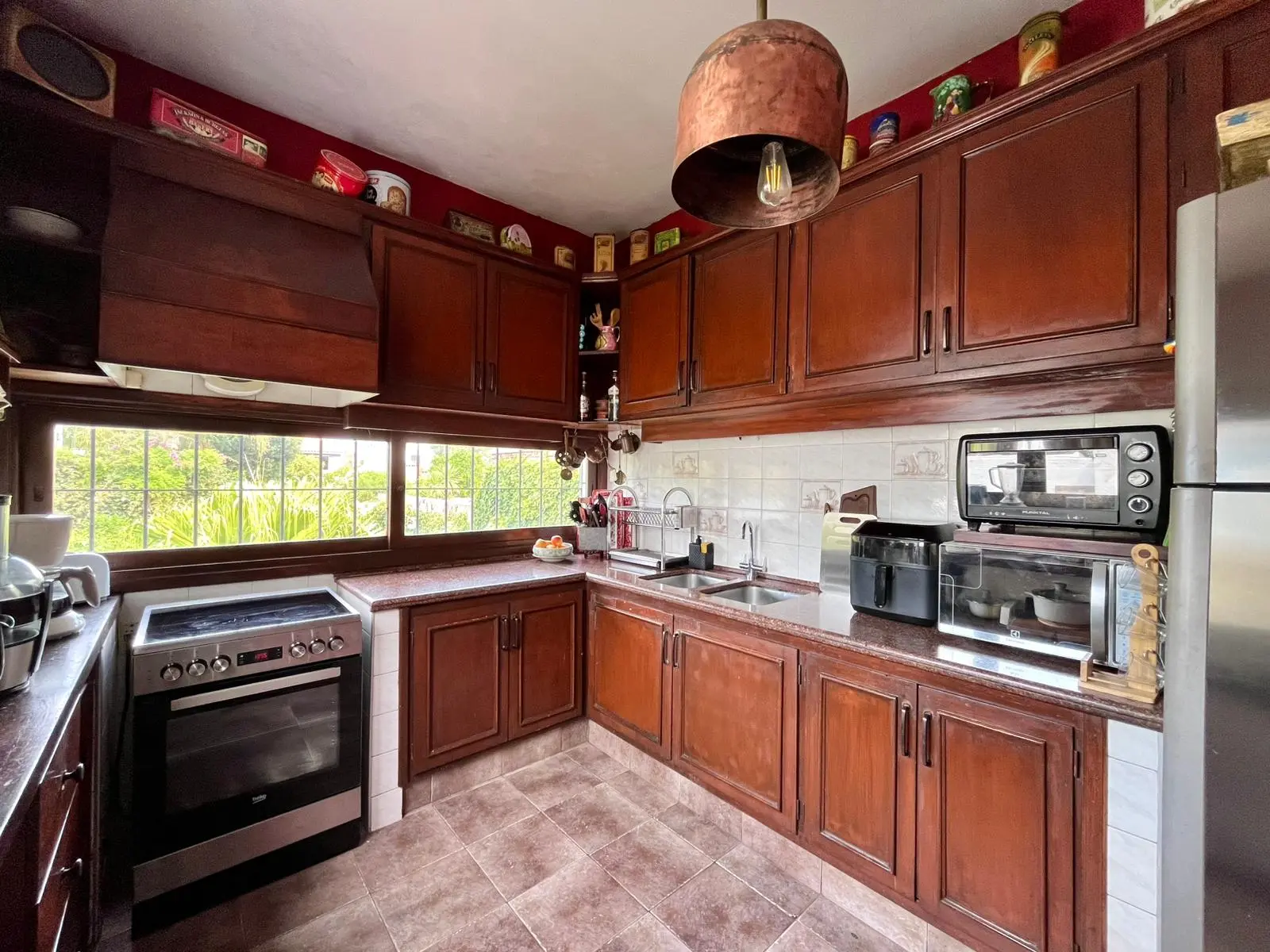 Cocina con vista al fondo y comedor diario con estufa de alto rendimiento que calefacciona gran parte de la casa.