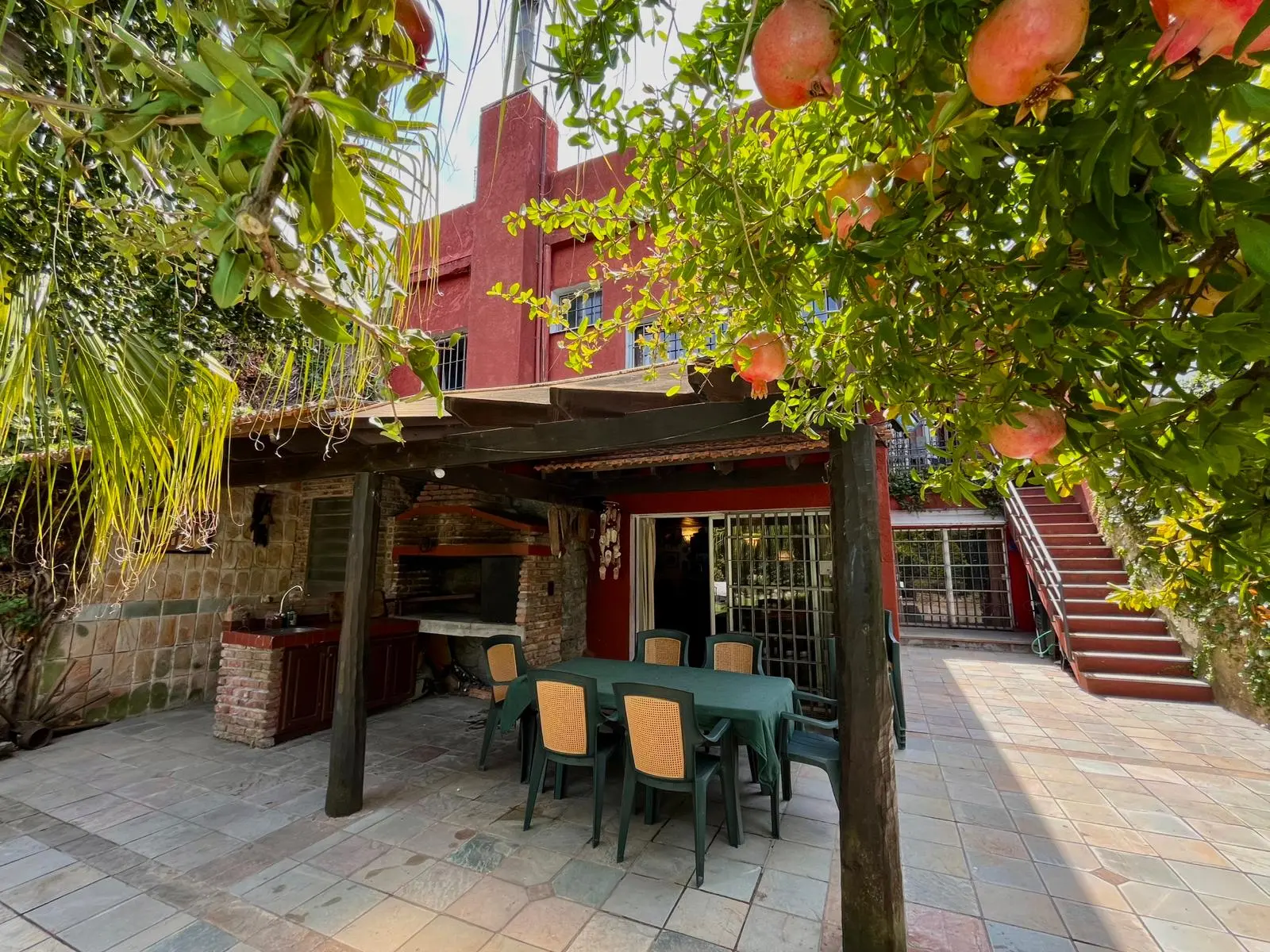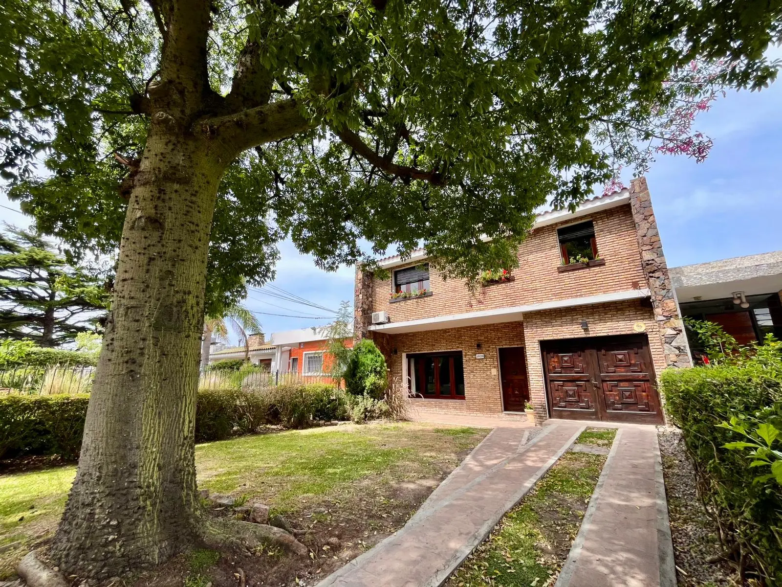 Tiene un amplio jardín al frente con un precioso palo borracho, con portón automático y garaje para 2 autos + lugar de estacionamiento en la entrada para 3 autos más.