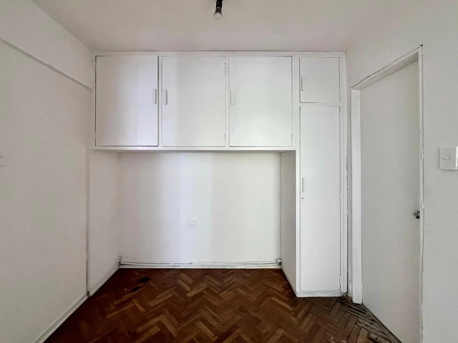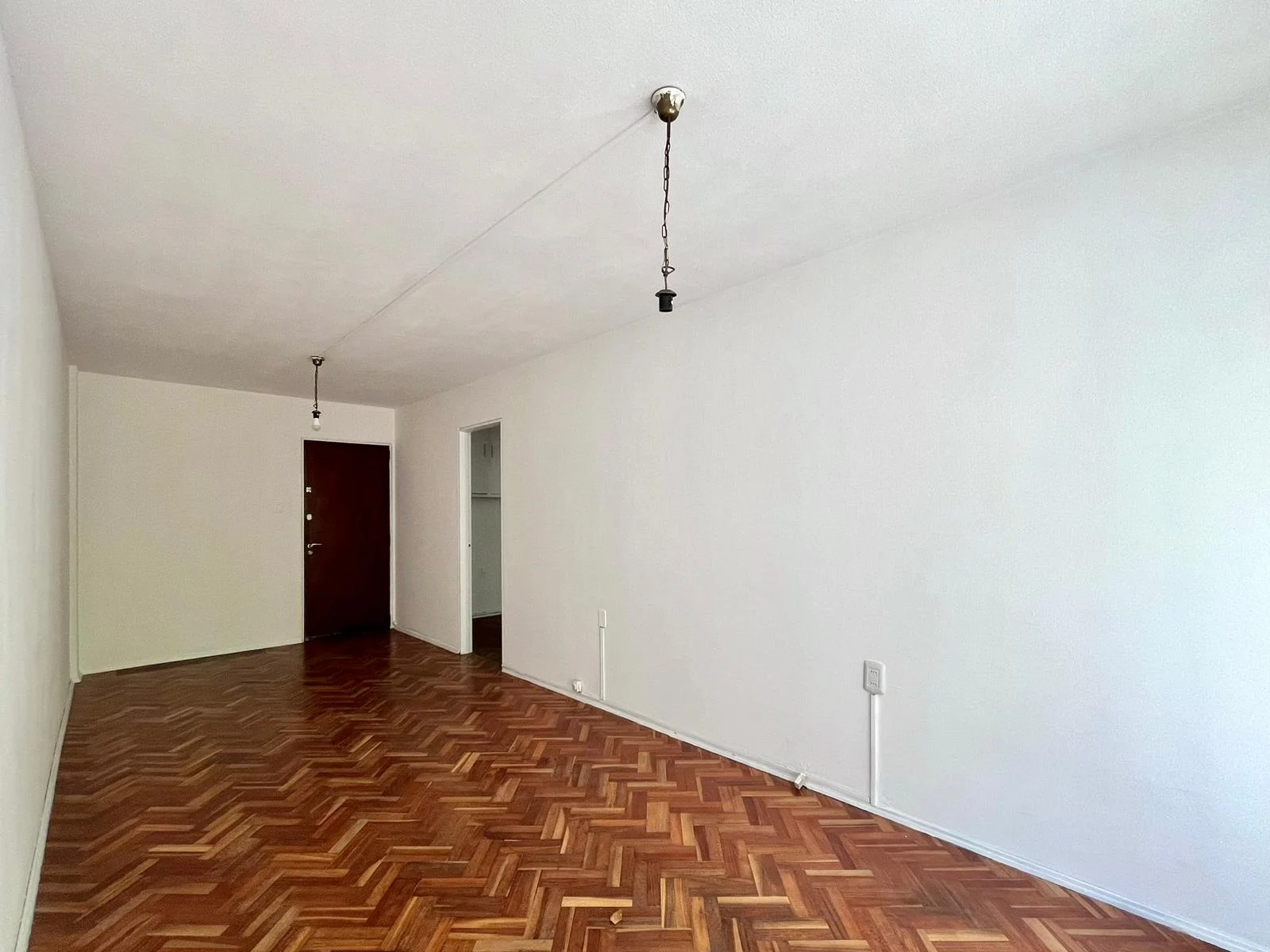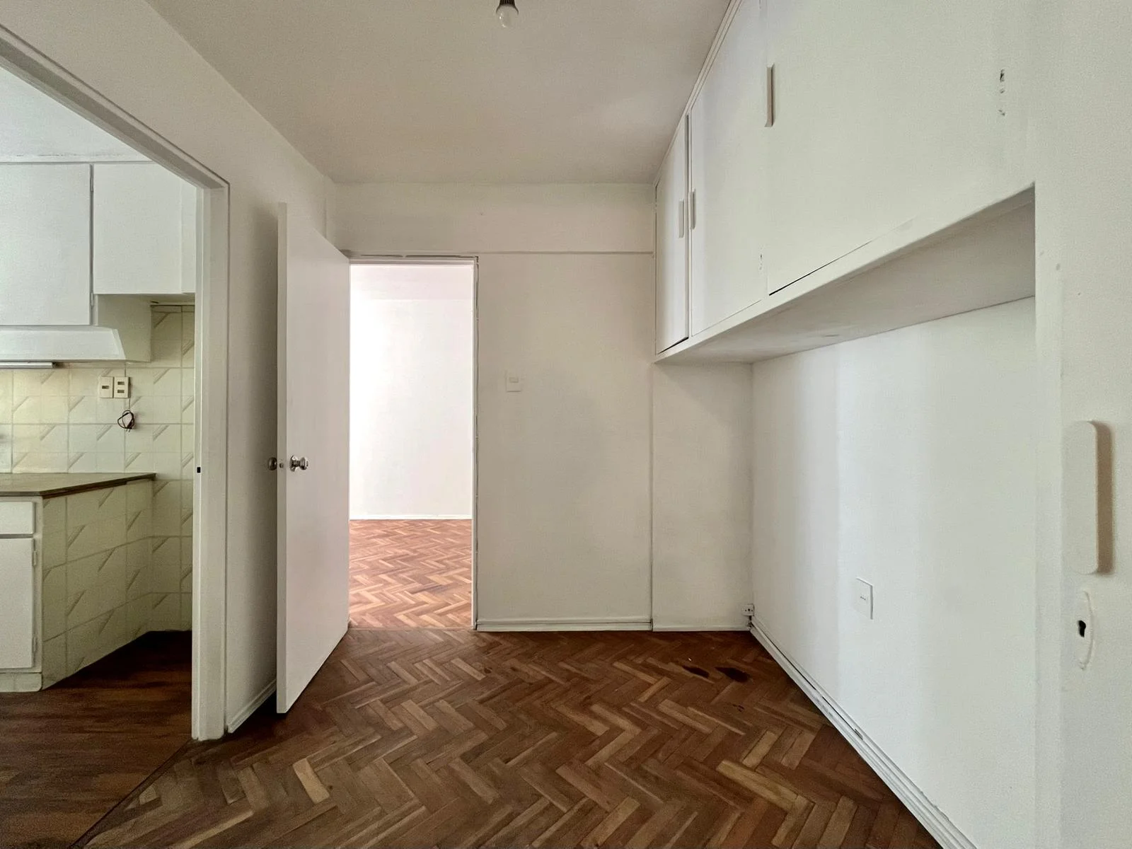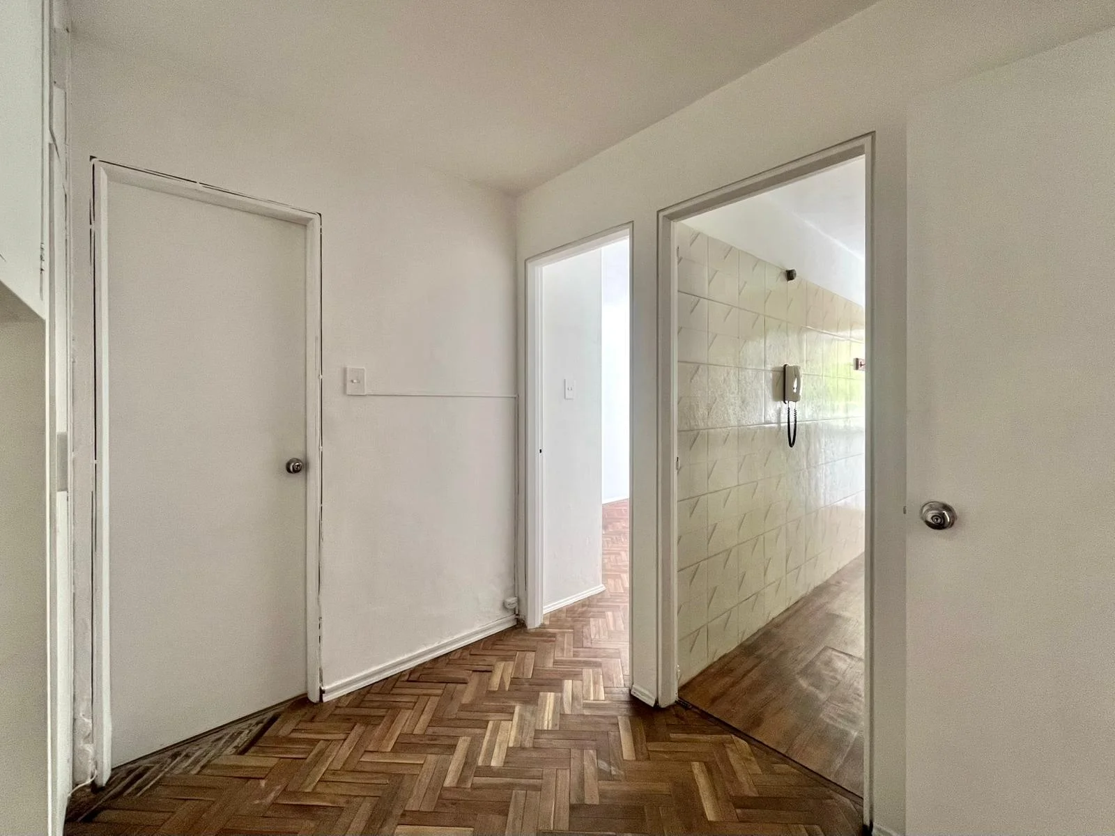 Gran hall de distribución con placar empotrado y piso de parqué.