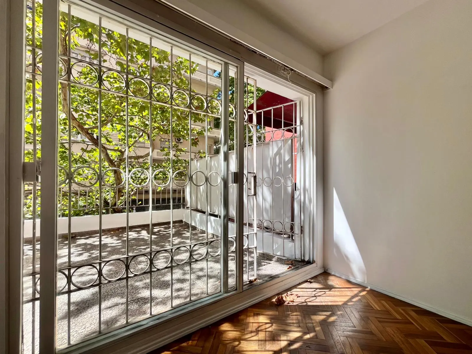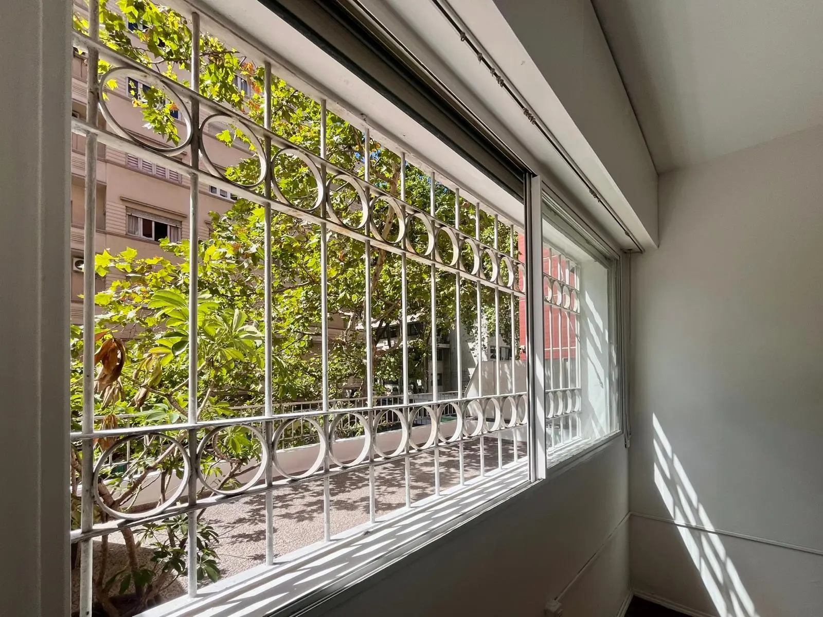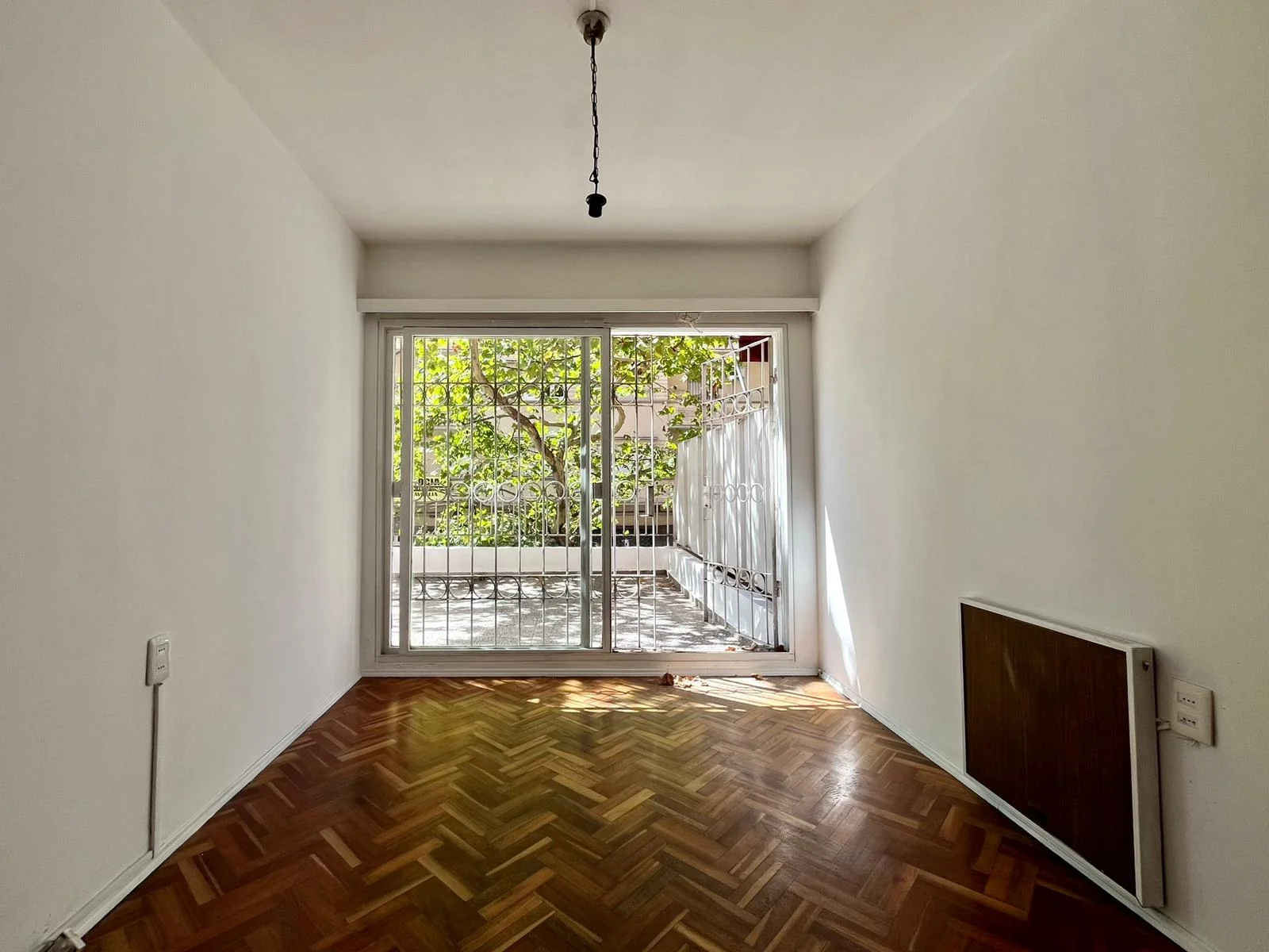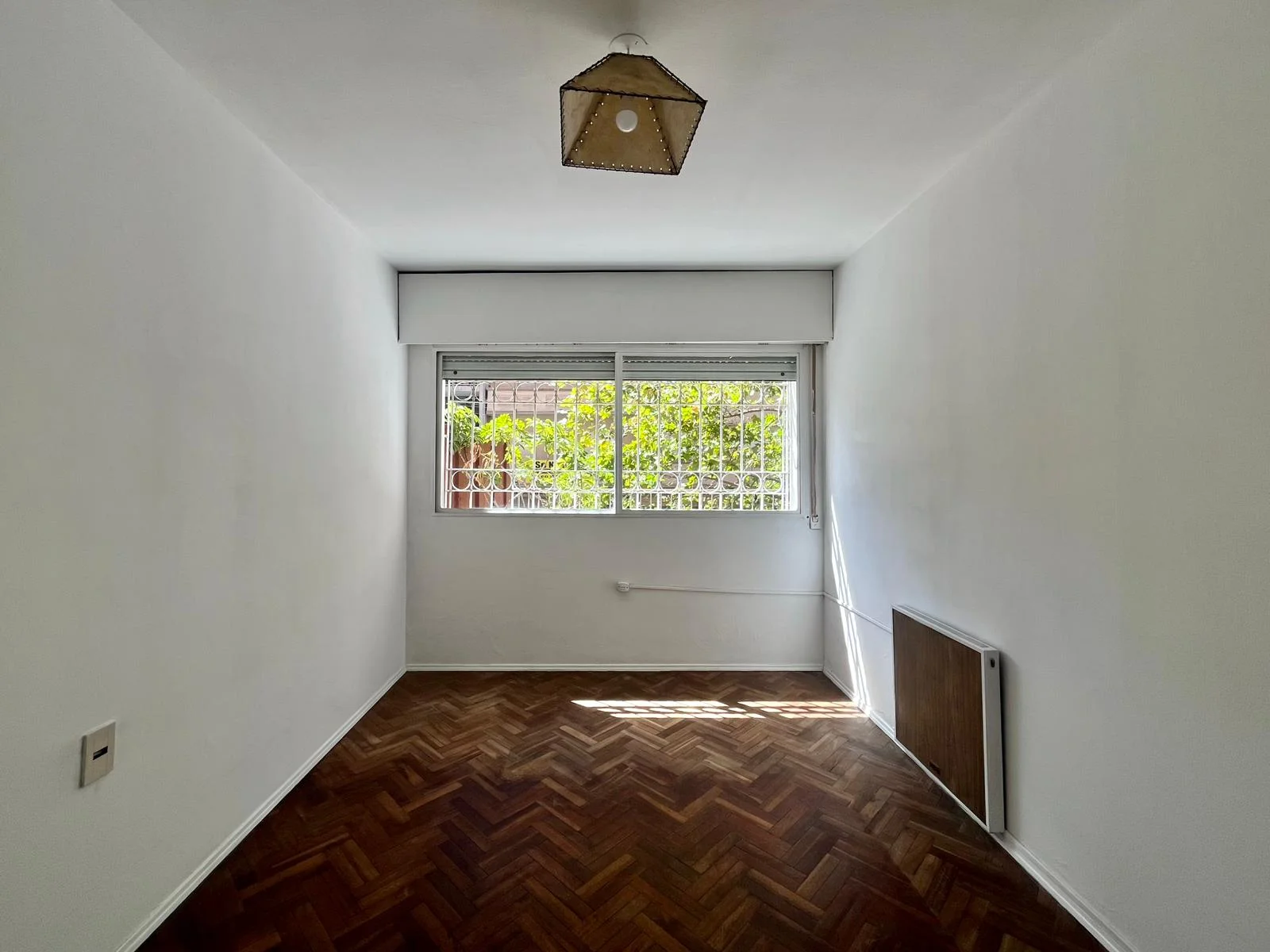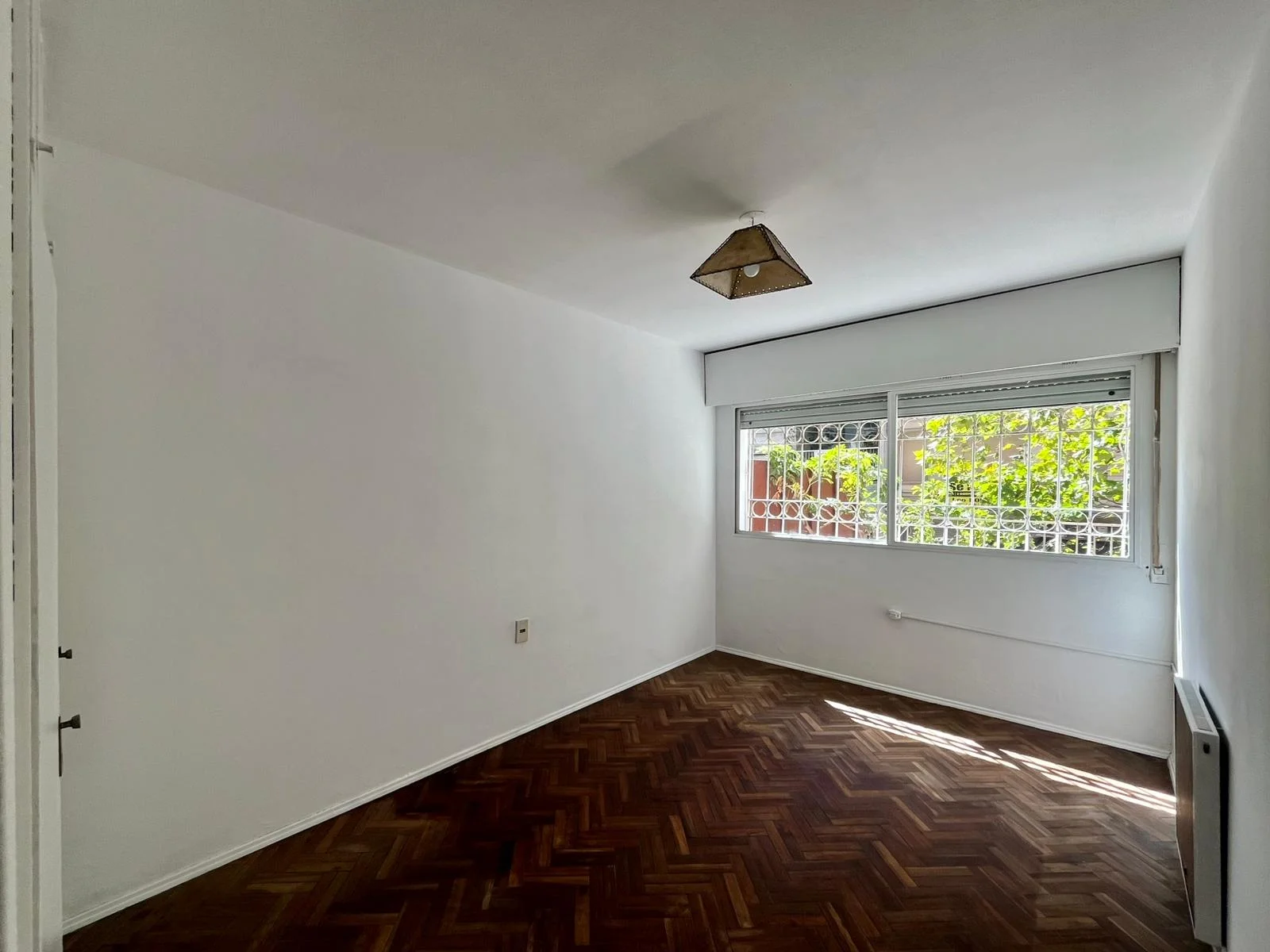 Dormitorio con piso de parqué, buen placar empotrado, persiana, ventana con reja y calefactor eléctrico funcionando.