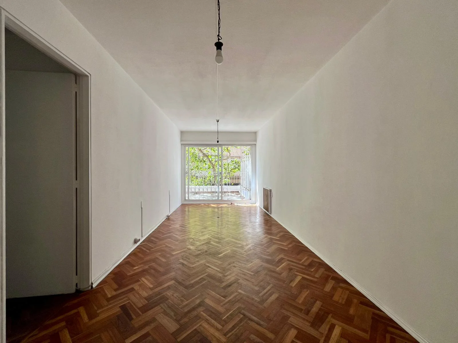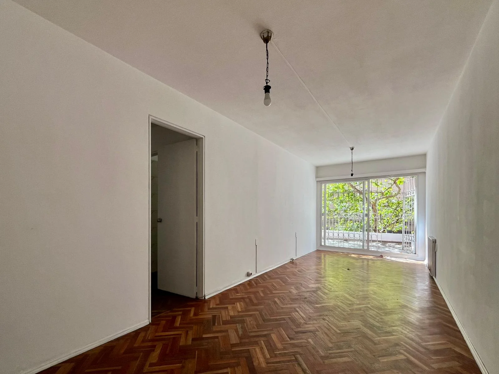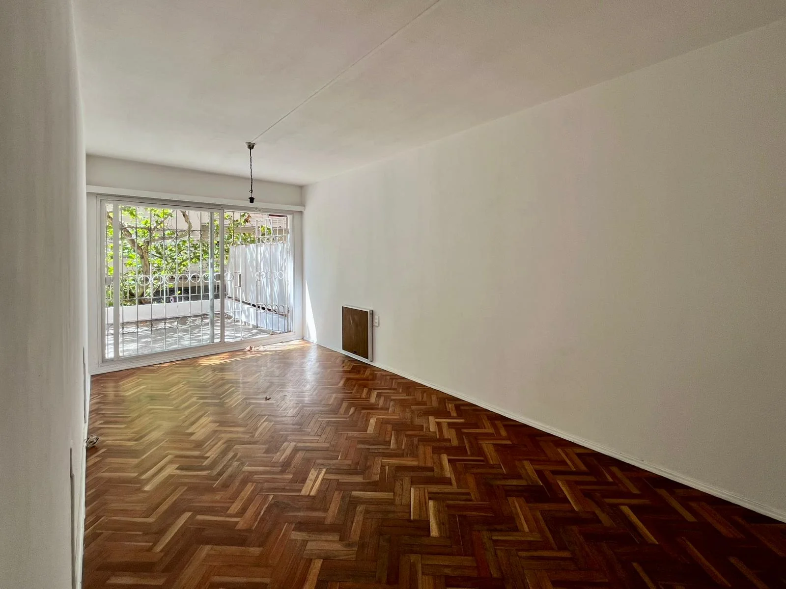 Luminoso living comedor con pisos de parqué en buen estado y calefactor eléctrico.