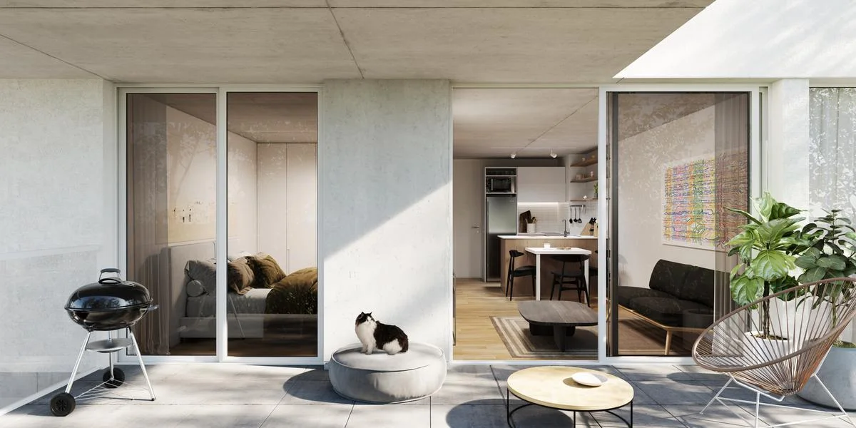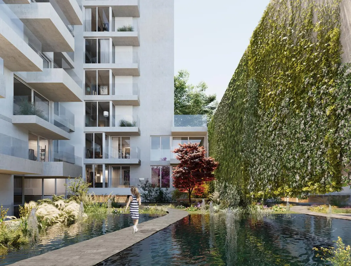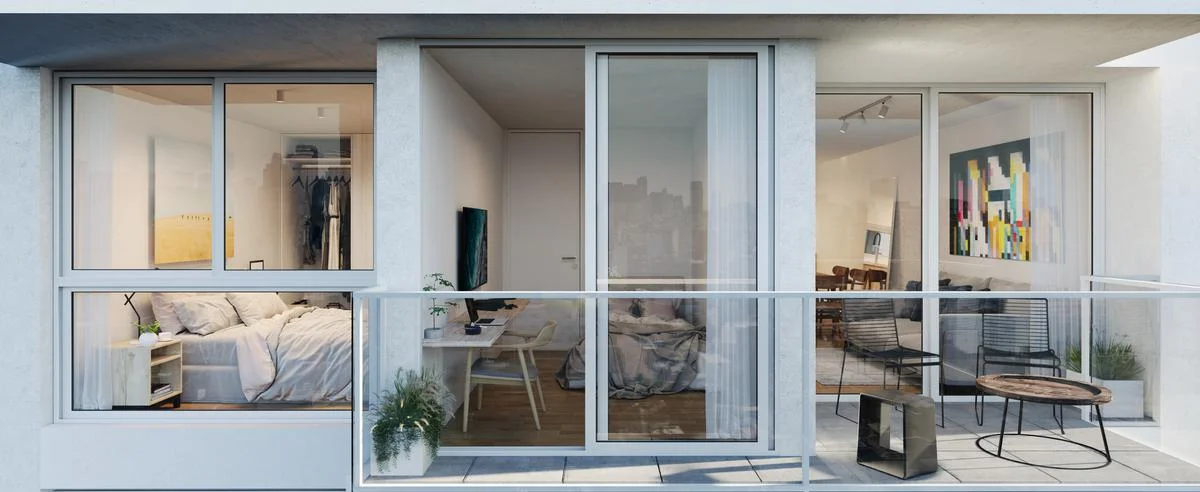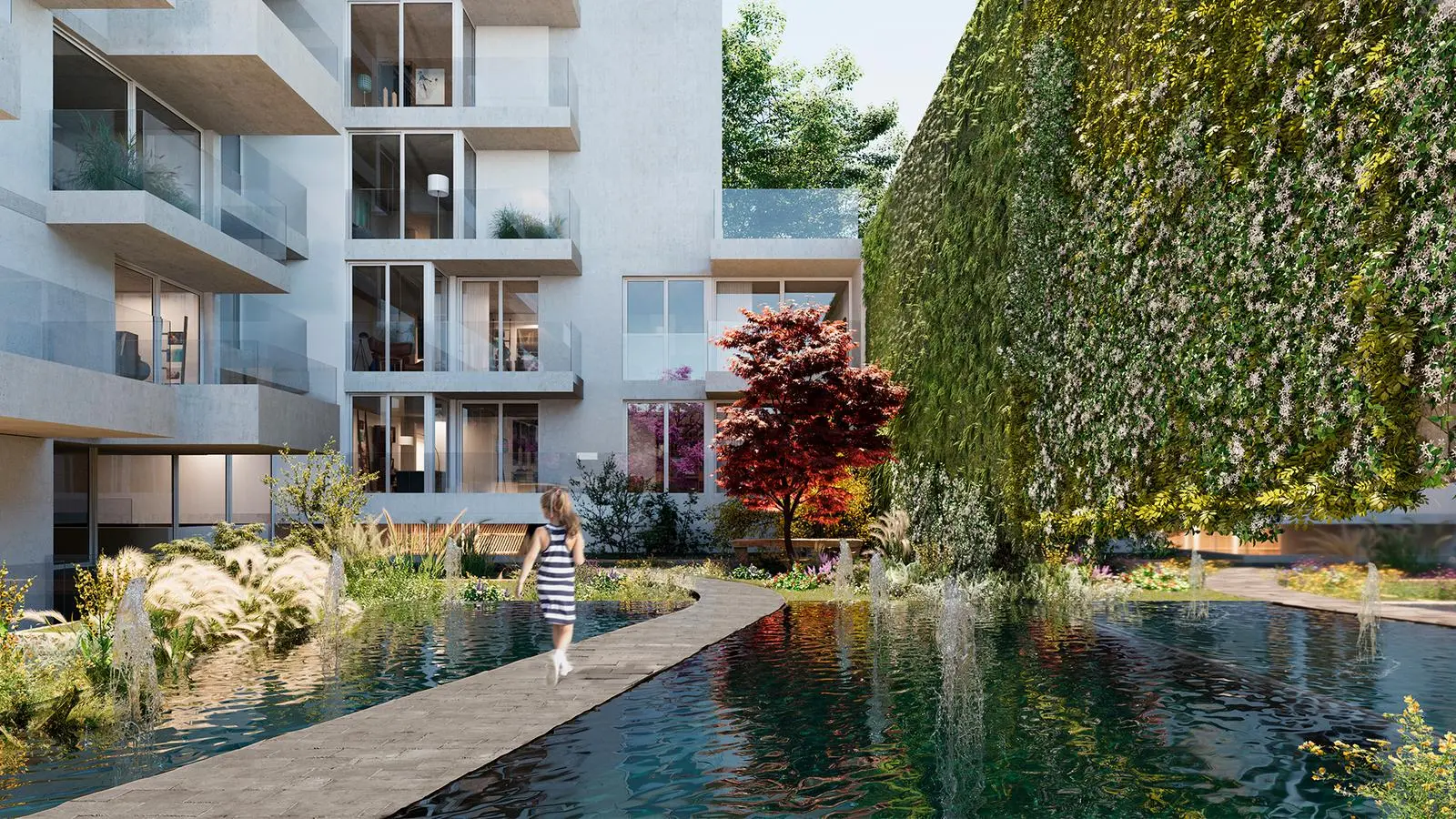 Unidad con terraza exclusiva de 6 m², con vista a espacios verdes y espejo de agua.