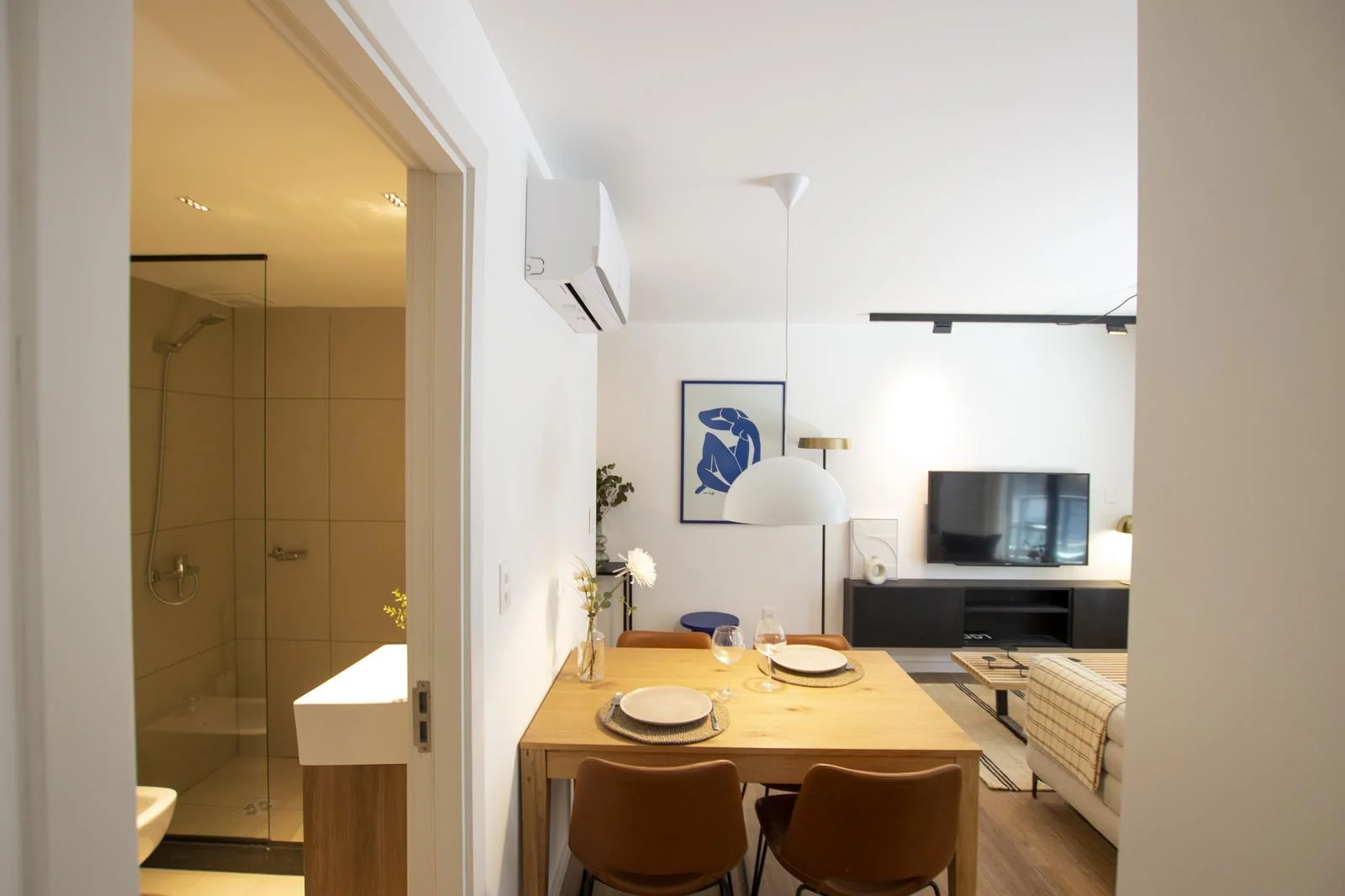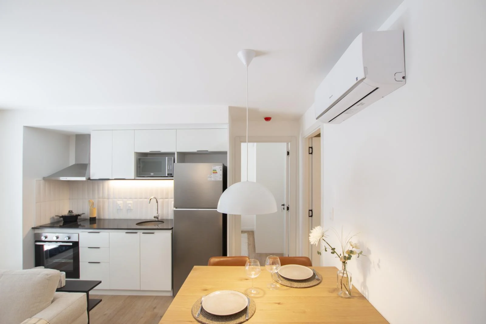 Kitchenette equipada con muebles bajo y sobre mesada, campana extractora y anafe