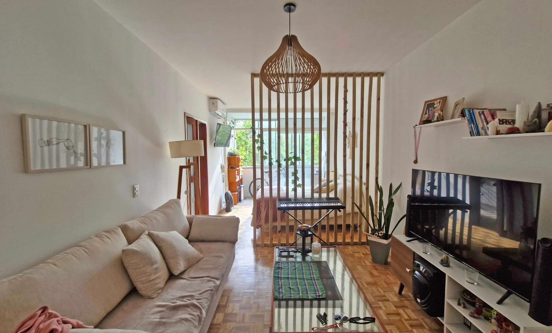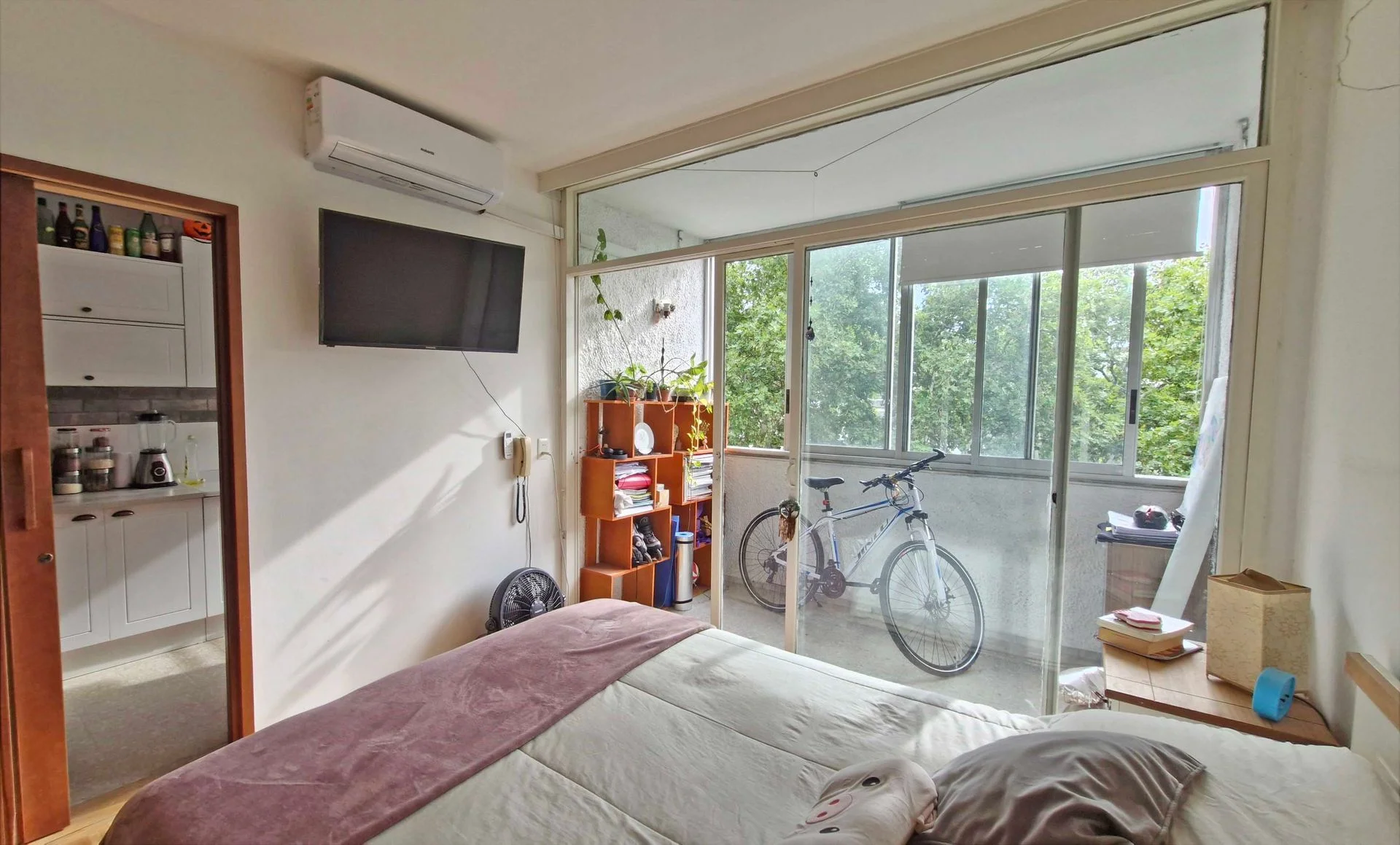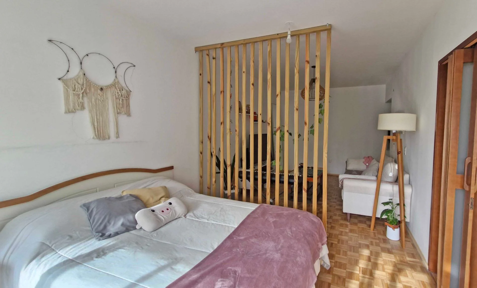-Área de estar y dormitorio separados mediante un panel traslúcido.