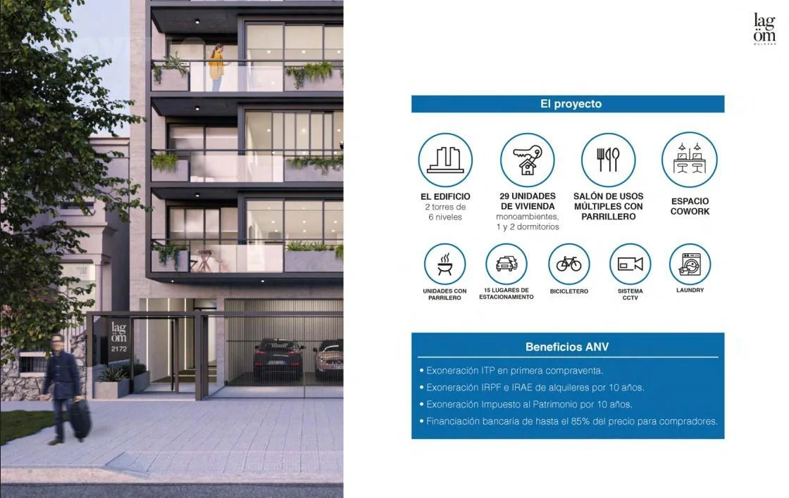 Conjunto residencial compuesto por dos torres de 6 niveles con un total de 29 unidades en tipologías monoambiente, 1 y 2 dormitorios.