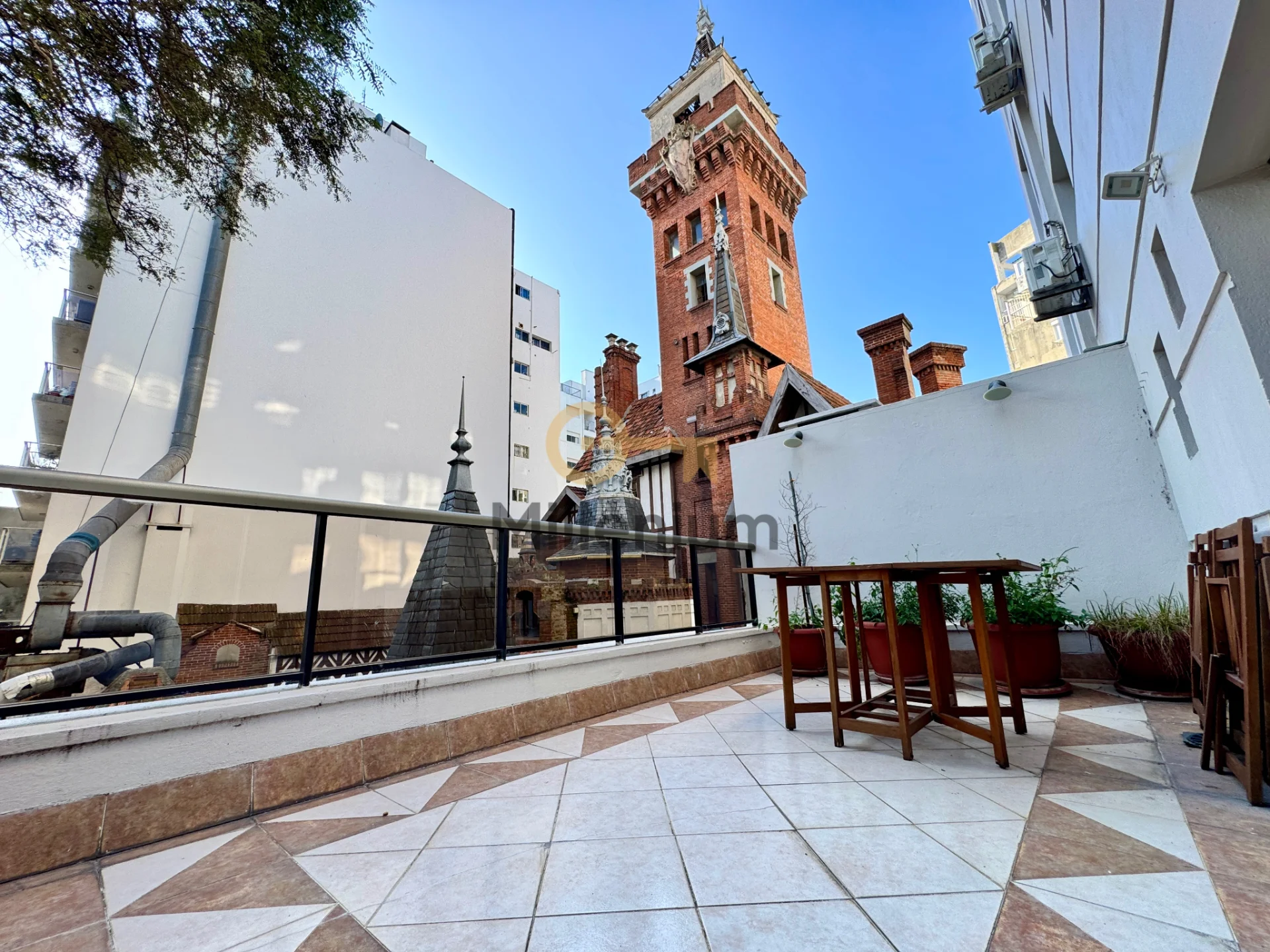 Un dormitorio con placar y un baño completo. Desde el dormitorio se accede a una segunda terraza con una hermosa al Castillo Pittsmiglio.