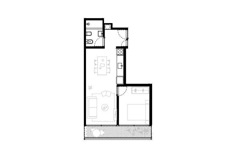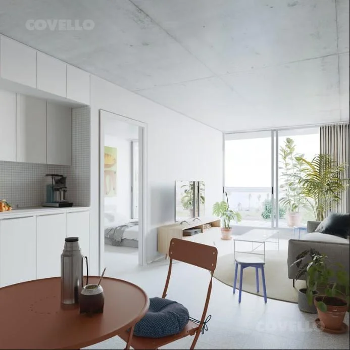 Apartamento de 1 dormitorio de 42.38 m² interiores con terraza de 7.08 m², ubicado en el innovador edificio Près Mauá, en pleno eje costero de Montevideo.
