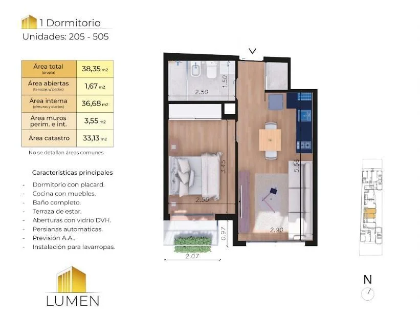 La unidad cuenta con 36.68 m² interiores, 1.67 m² de terraza, logrando un total de 38.35 m² muy bien aprovechados, con una distribución eficiente que maximiza la luz natural y el espacio.