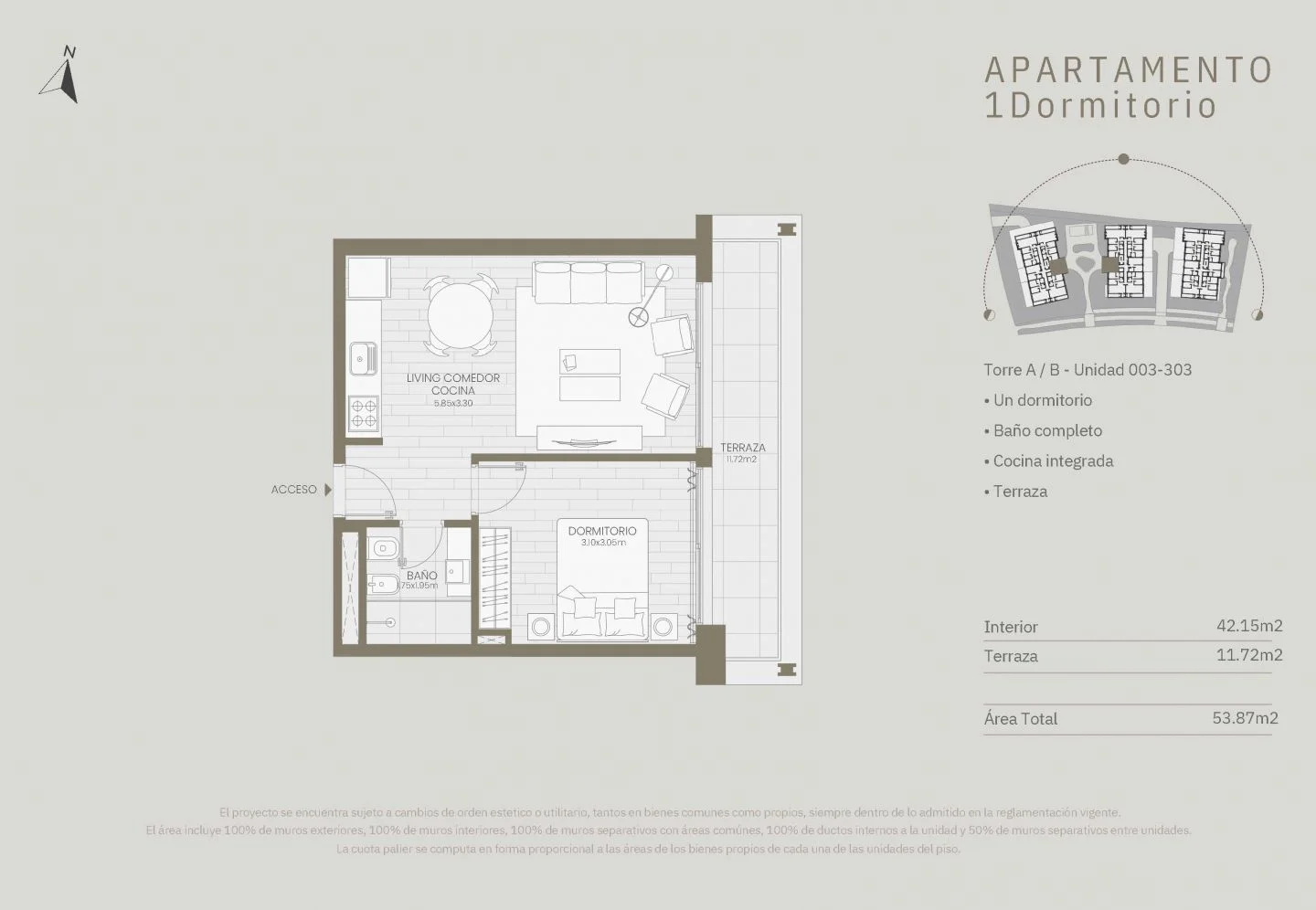 Esta unidad de la torre B, se desarrolla en 37 m² de interiores y 12 m² de terraza. Superficie APPCU 60 m². Cómodo living comedor con salida a terraza. Cocina integrada. 1 dormitorio con salida a terraza. 1 baño completo.