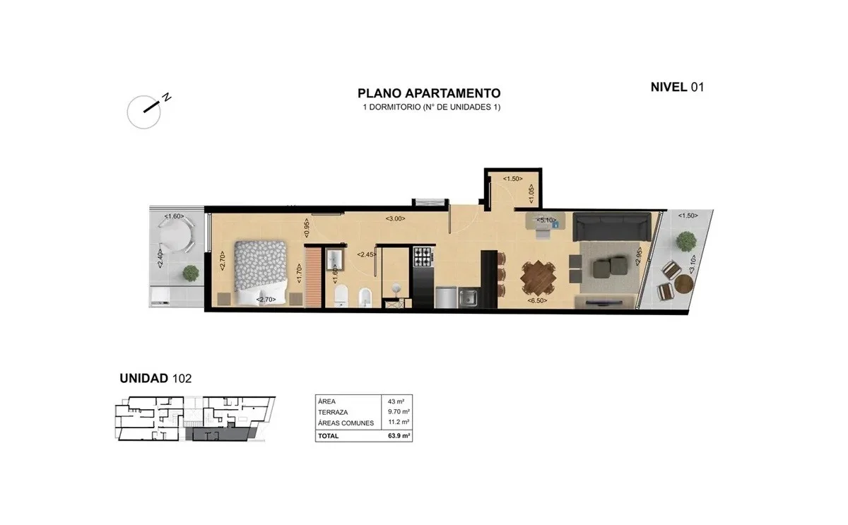 Ubicado en un primer piso por ascensor, el apartamento de 63 metros cuadrados totales cuenta con: