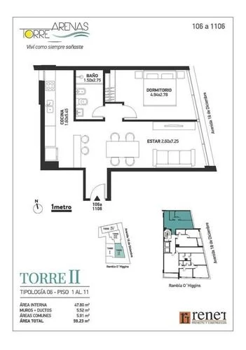 Torre 2 - Unidad: 406 - Se trata de un apartamento de 59 m2, compuesto por 1 dormitorio, baño y cocina integrada al living comedor.
