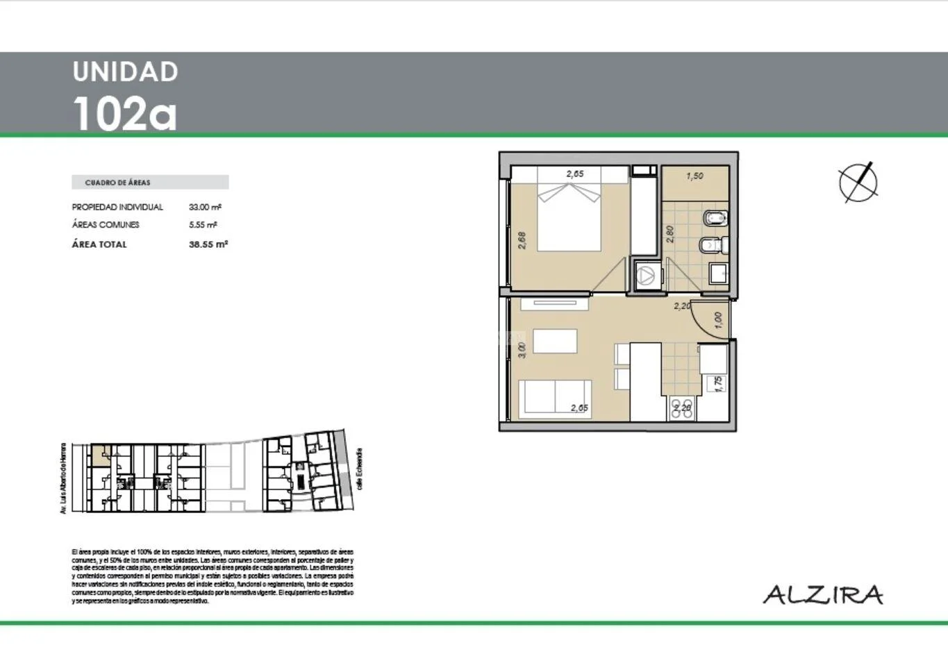 METRAJE: 33,00m área propia + 5,55m área común = 38,55m totales.