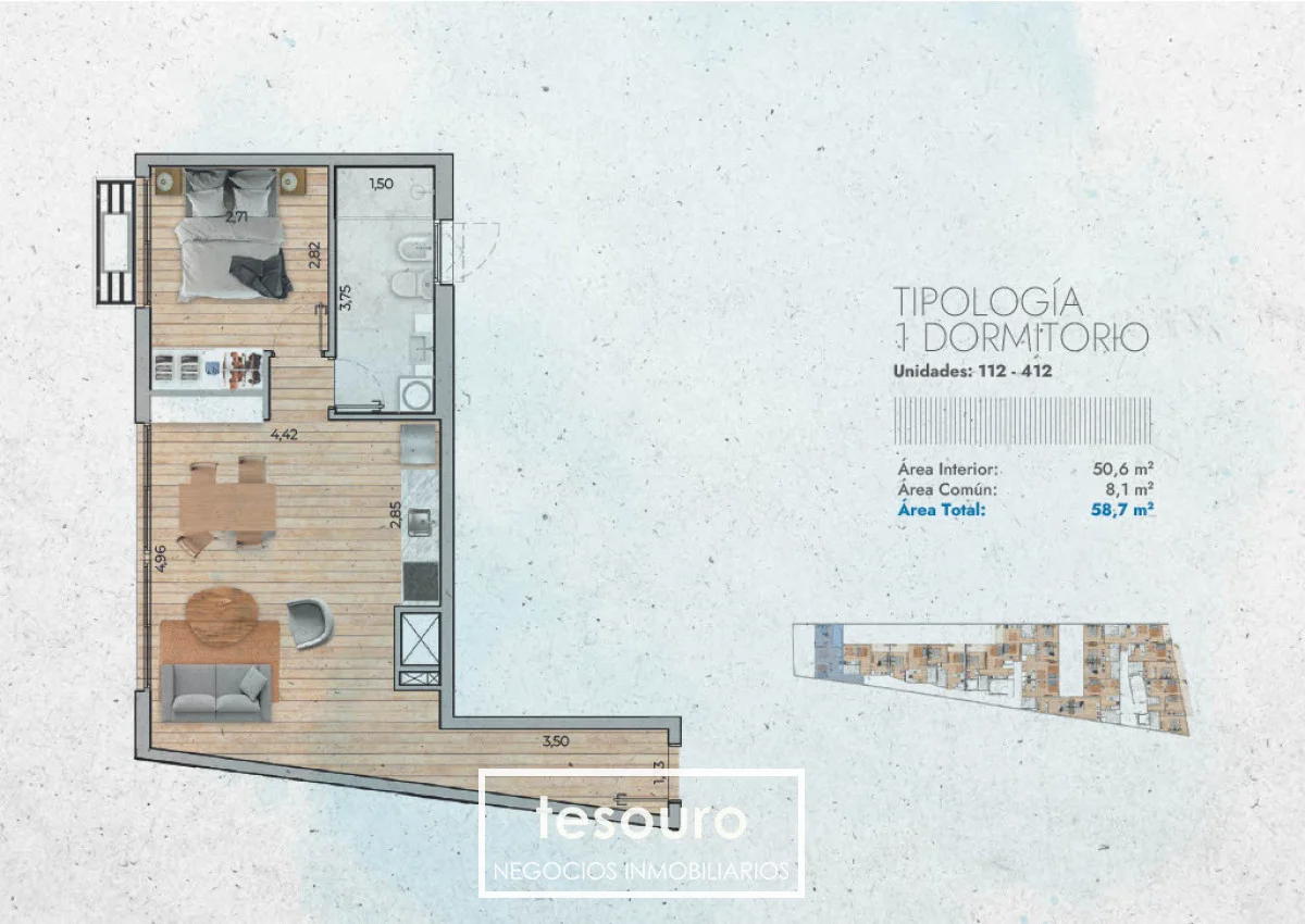 Ubicado en una zona inmejorable de Montevideo, Novus 26 cuenta con modernos apartamentos de 1 y 2 dormitorios que combinan confort y funcionalidad. Viví en una ubicación privilegiada con todo lo que necesitás al alcance. Novus 26. Apartamento en venta Tercer piso al contrafrente Living-comedor con terraza Cocina integrada con placares 1 Dormitorio con placares 1 Baño completo con termotanque Calefacción por losa radiante Amenities y Servicios: - Barbacoa - Gimnasio completamente equipado - Solarium - Lavadero - Bike parking - Videovigilancia 24 hs - Wifi en espacios comunes Y más... Garage a partir de U$S 29.000 No dudes en consultarnos! Somos Tesouro Negocios Inmobiliarios Referencia Interna : Tera-5055