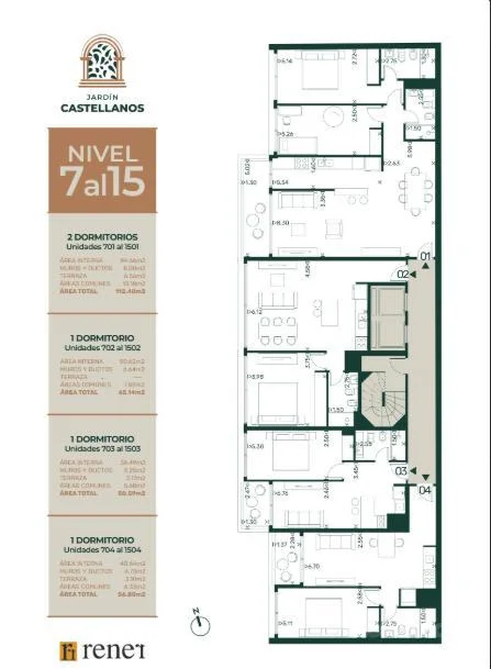 Torre única de 15 pisos con 56 unidades, brindando privacidad y exclusividad.