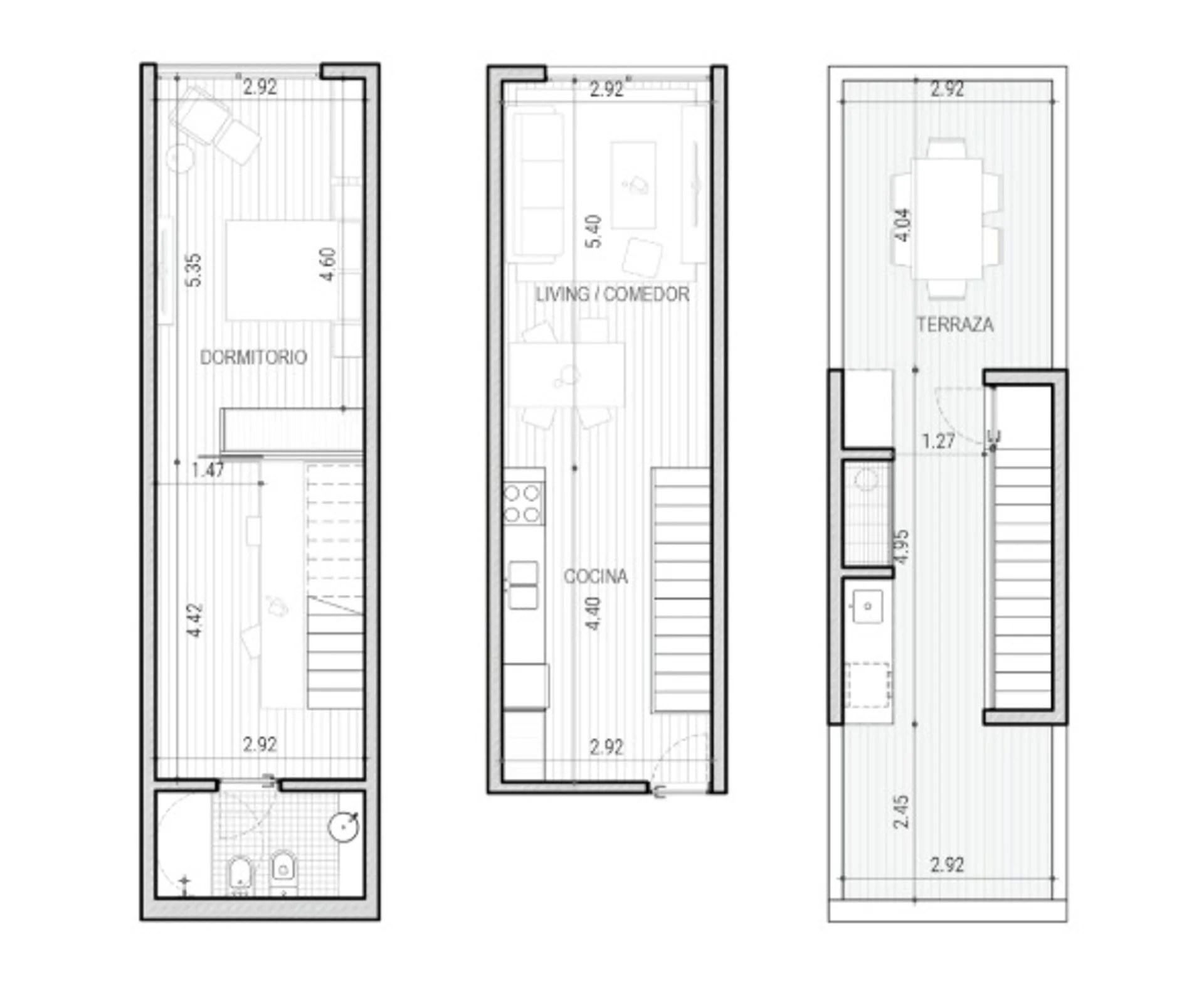 Planta baja: Living comedor con salida a patio de 17 m2 y cocina integrada.