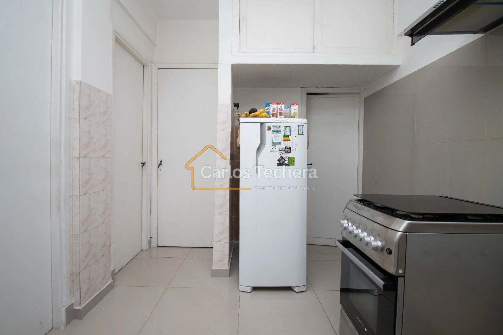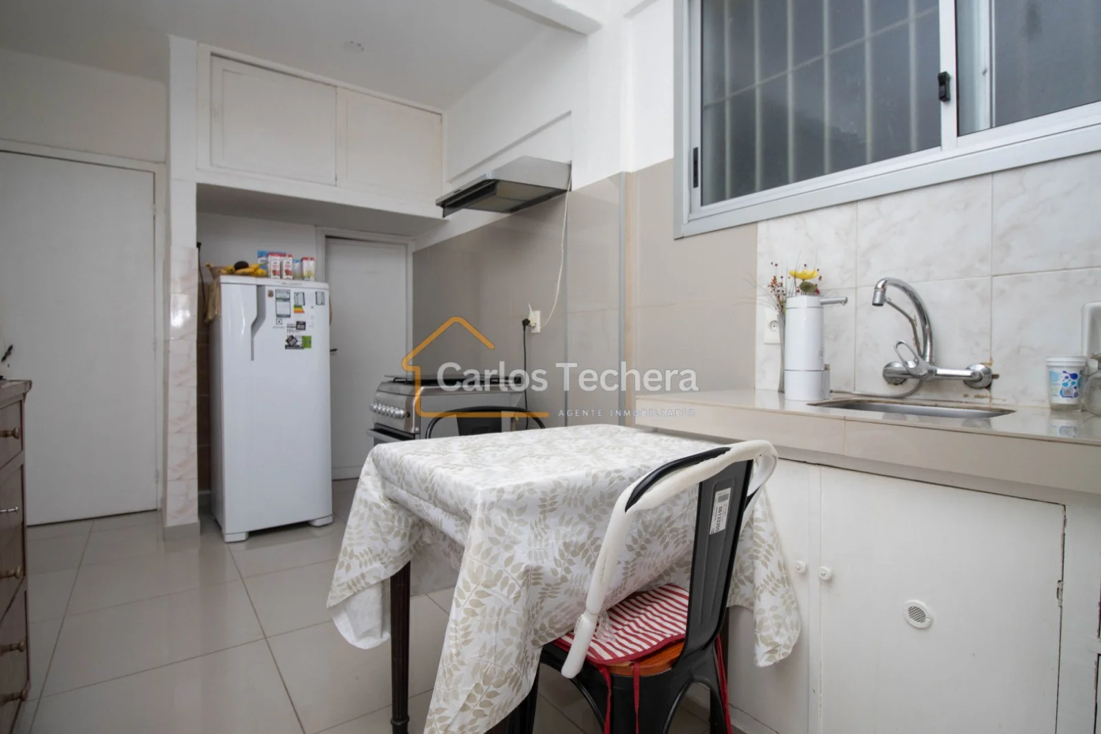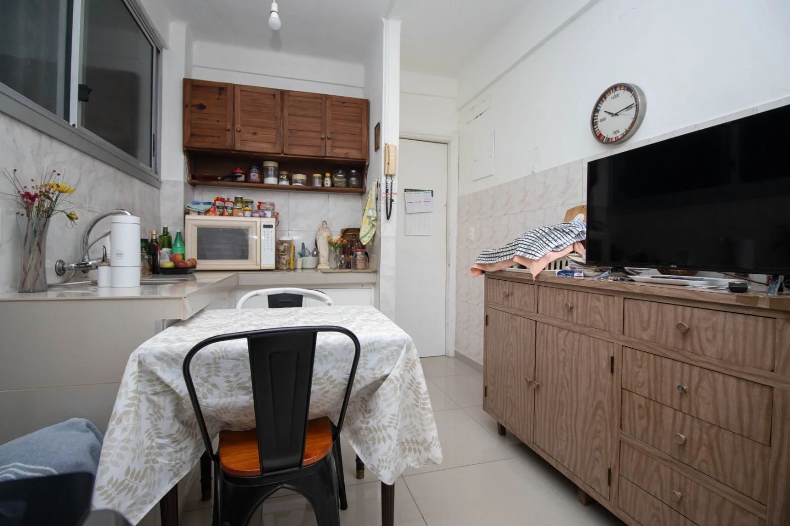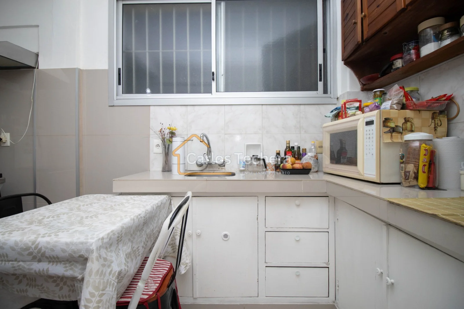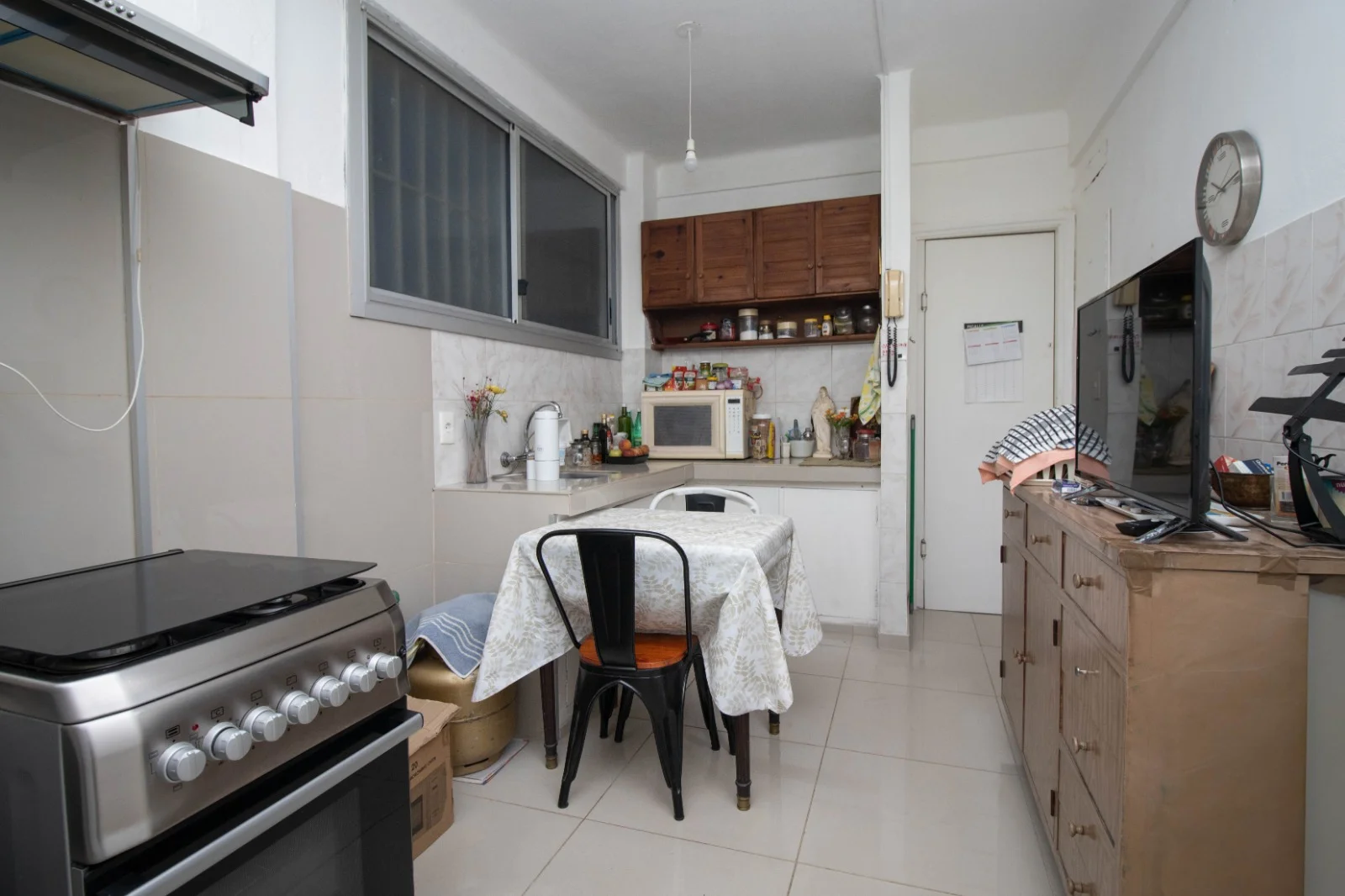 Cómoda cocina con revestimiento cerámico nuevo en paredes y piso , mesada de granito, placares sobre y bajo mesada en buen estado.