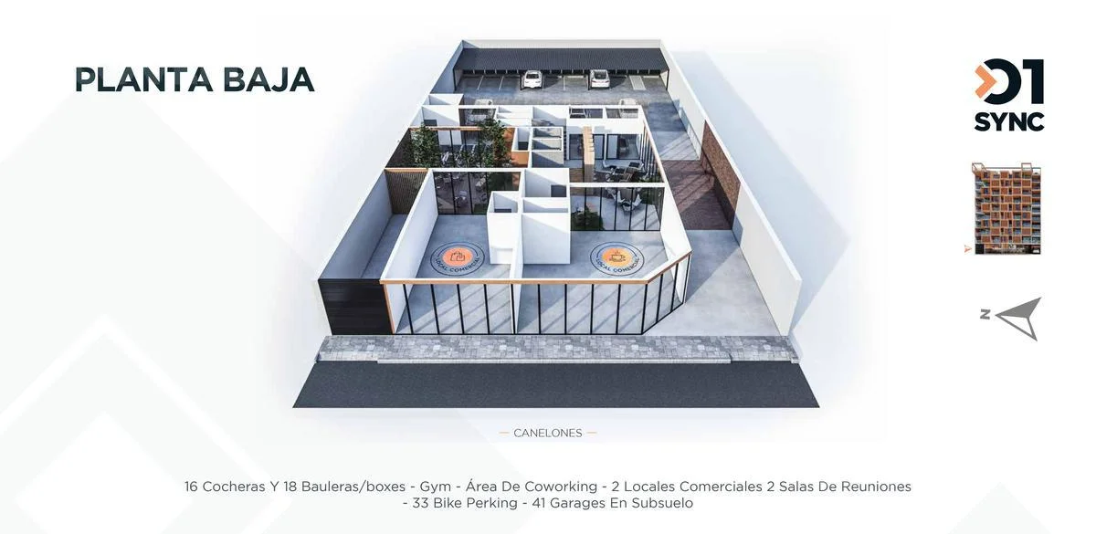 Garajes, cocheras semicubiertas, boxes y bike parking.