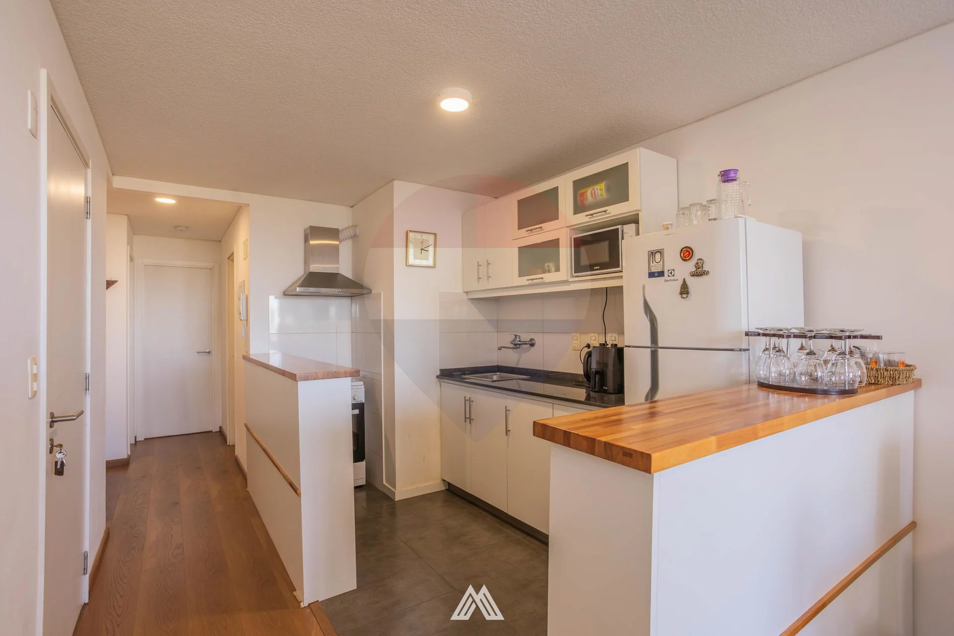 _ Cocina integrada con barra desayunadora y campana de extracción .