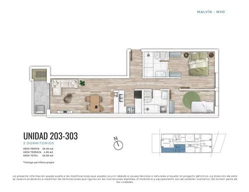 Unidad 303 - Se trata de un apartamento 2 dormitorios de 60 m2 con living comedor, cocina integrada, baño y terraza y parrillero.
