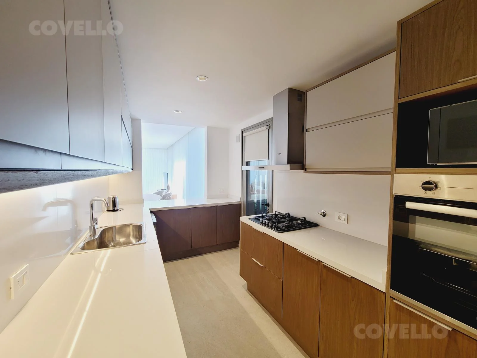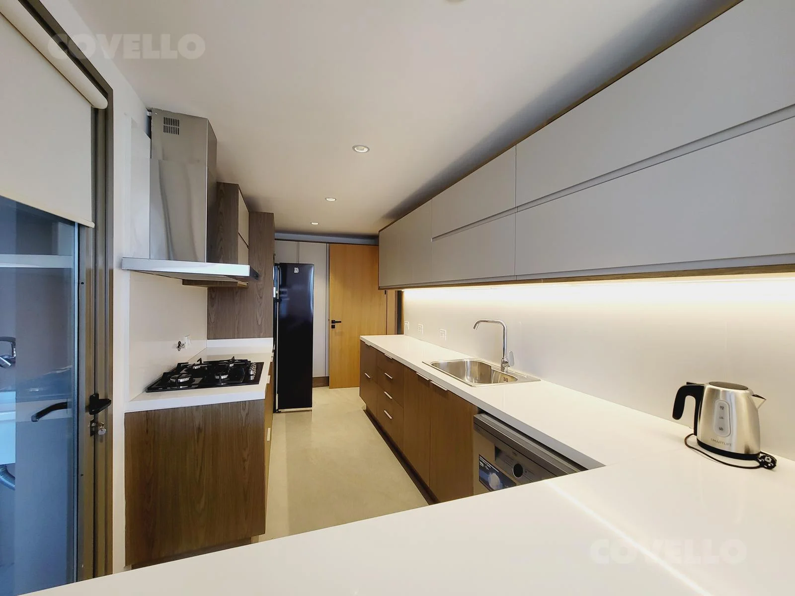 Cocina definida equipada con muebles bajo mesada, horno, anafe y campana