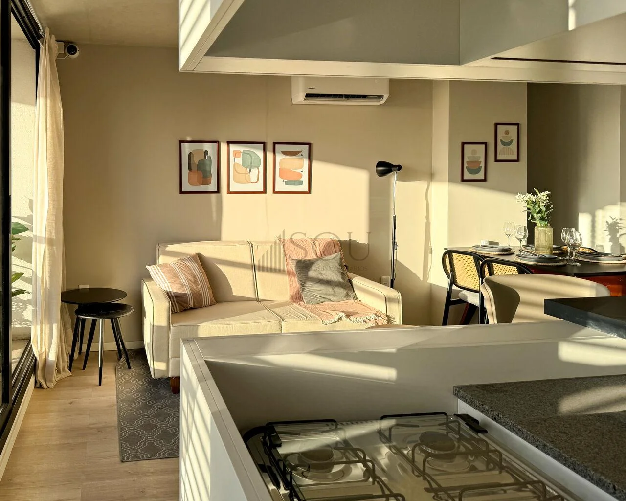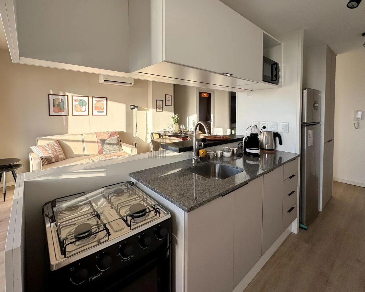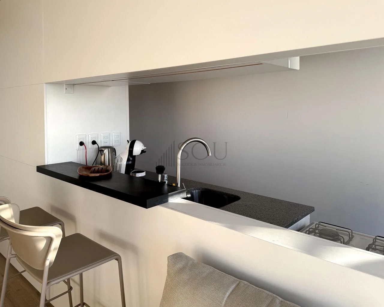 El living y la cocina tienen una división moderna que aprovecha muy bien los espacios generando lugar de guardado sin quitar independencia visual al living.