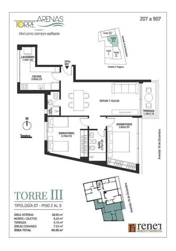 Torre Arenas - Torre III - Unidad: 207 - Se trata de un apartamento de 90 m2, con dos dormitorios, un baño completo y un baño social, cocina definida, living comedor y terraza con hermosa vista al mar.