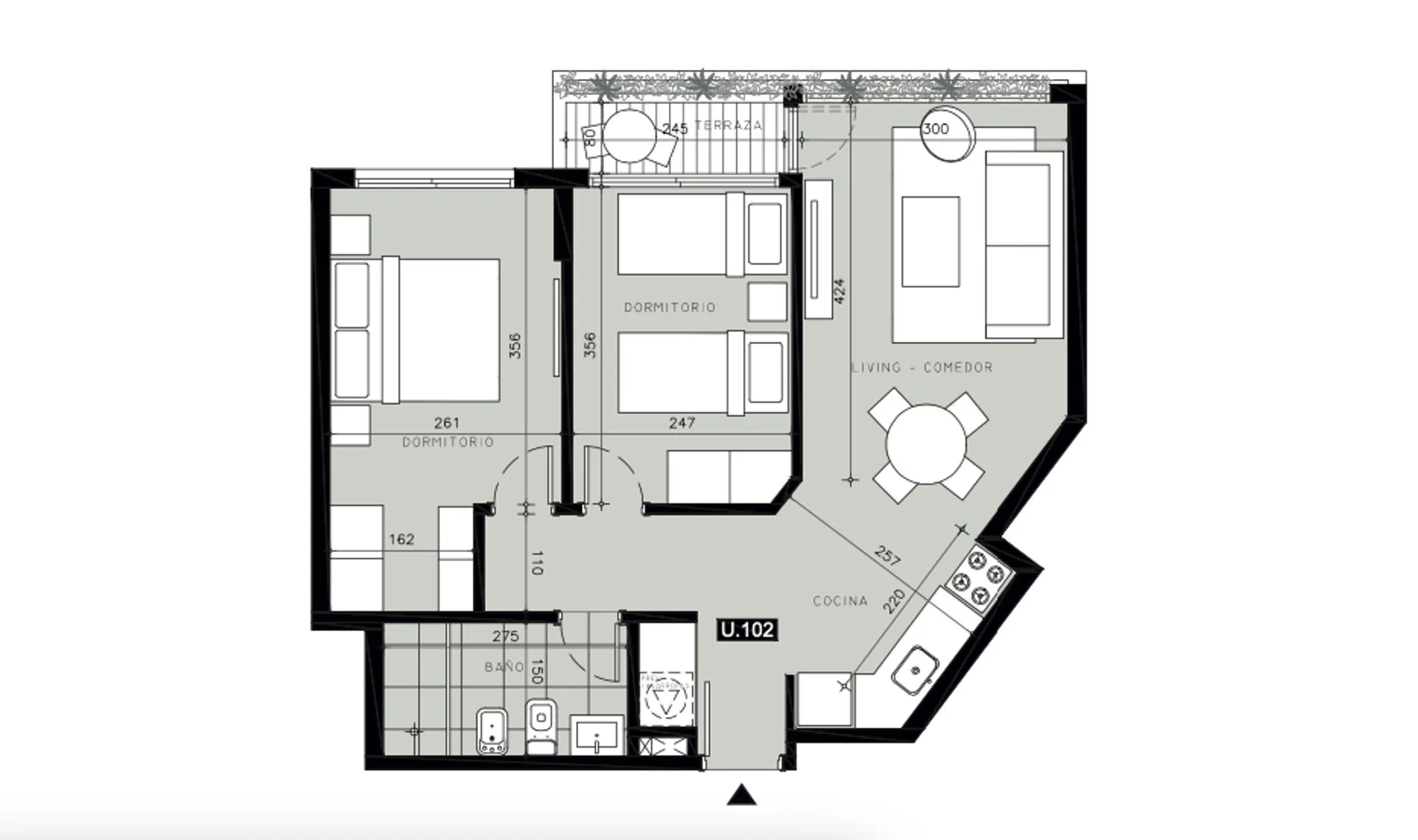 La unidad se distribuye en 3 ambientes, incluyendo 2 dormitorios y 1 baño completo. Al ingresar, se accede a un amplio espacio de living-comedor que cuenta con terraza desde e;l living. La cocina cuenta con muebles aéreos y bajo mesada de alta calidad, campana extractora y aire acondicionado ya instalado en el living, completando el sector social.