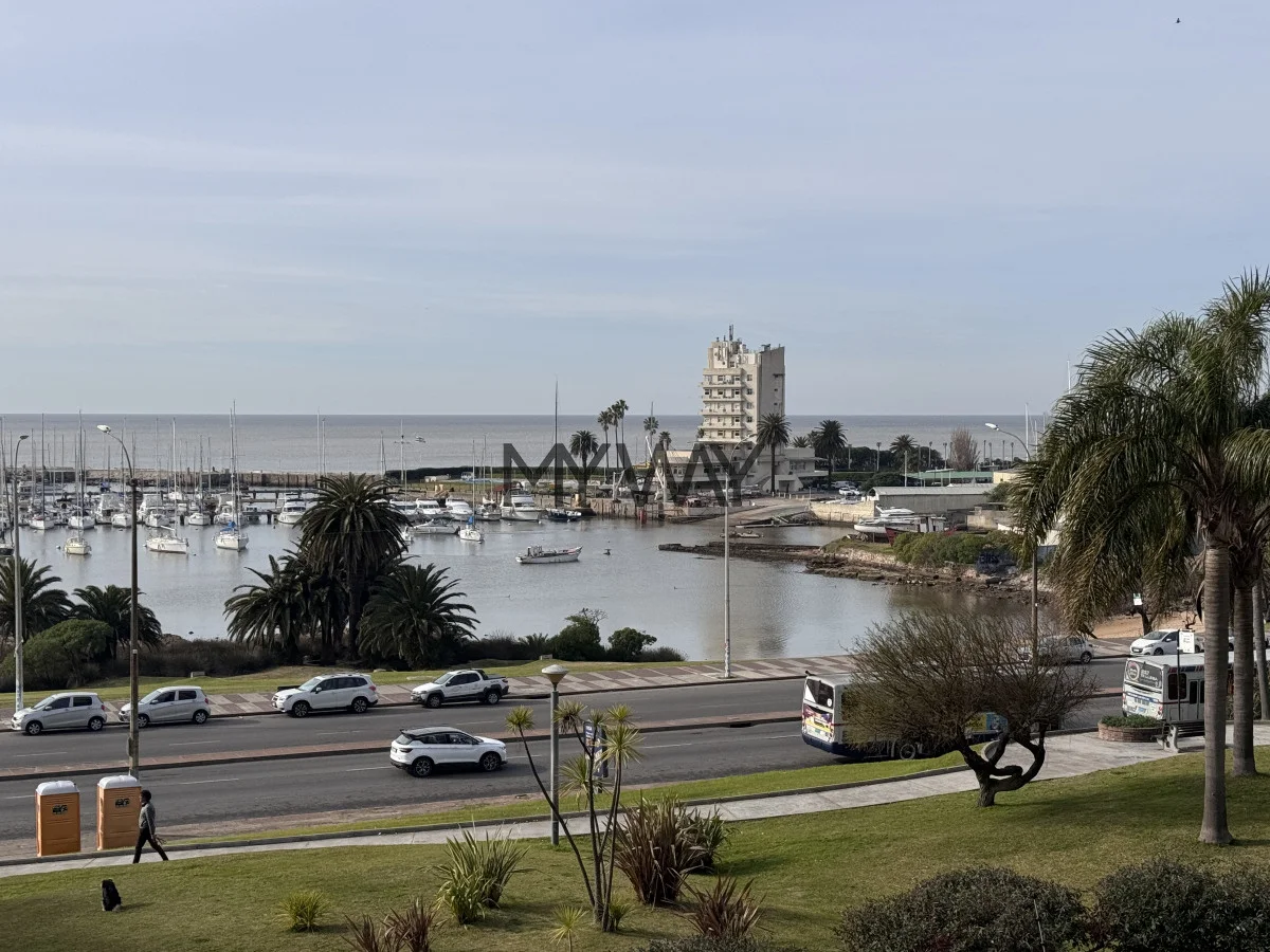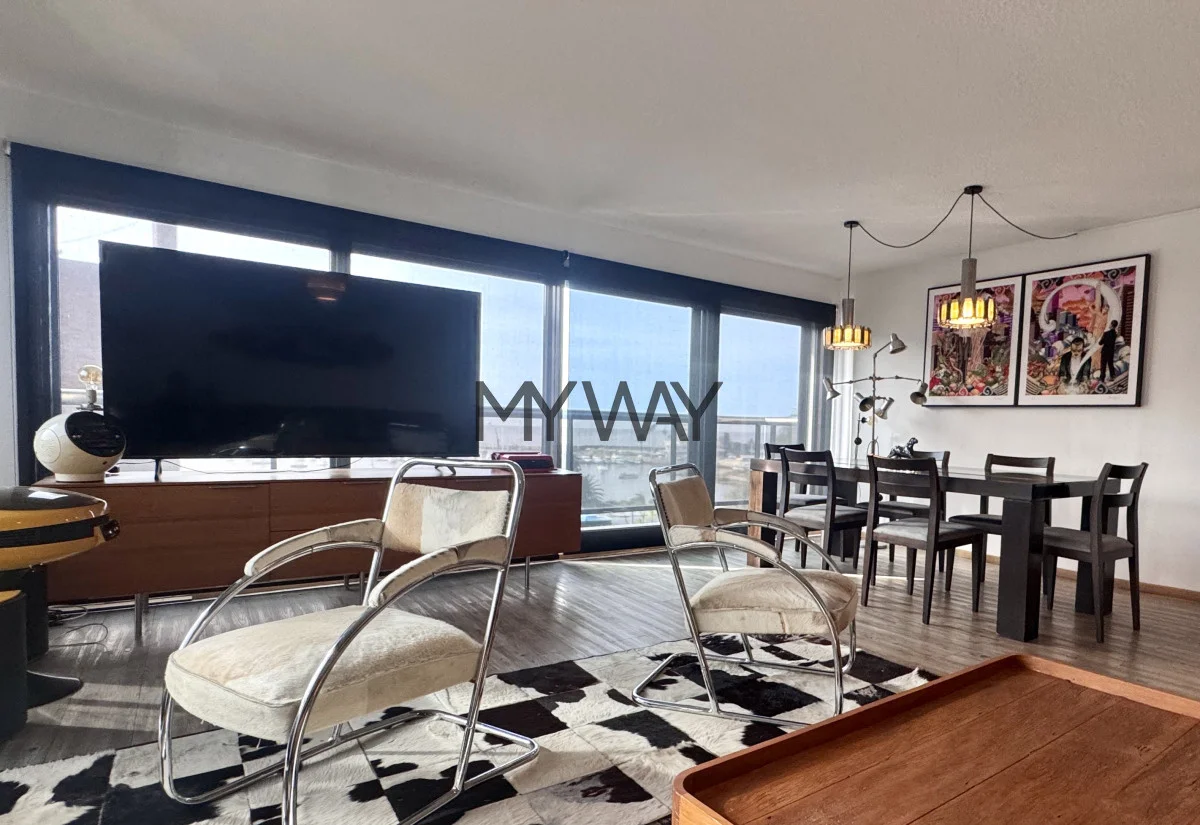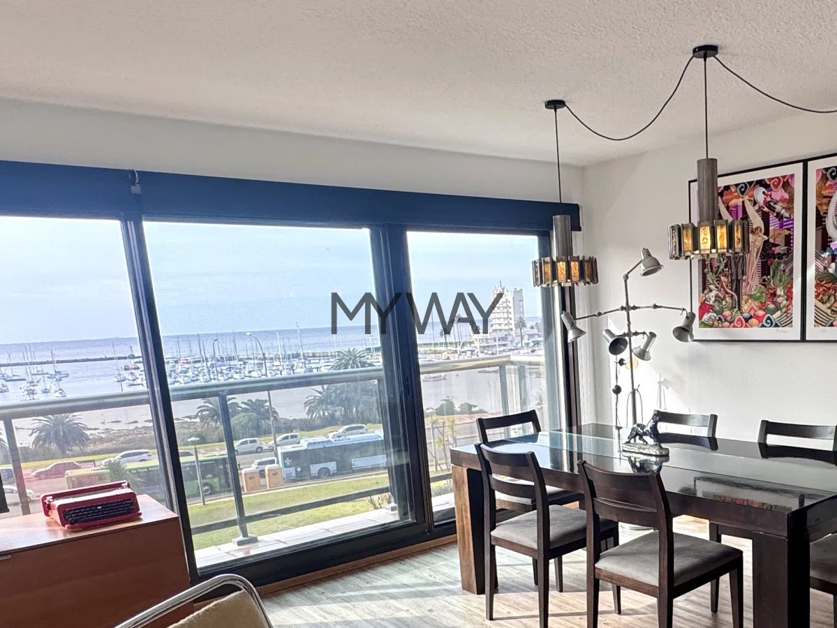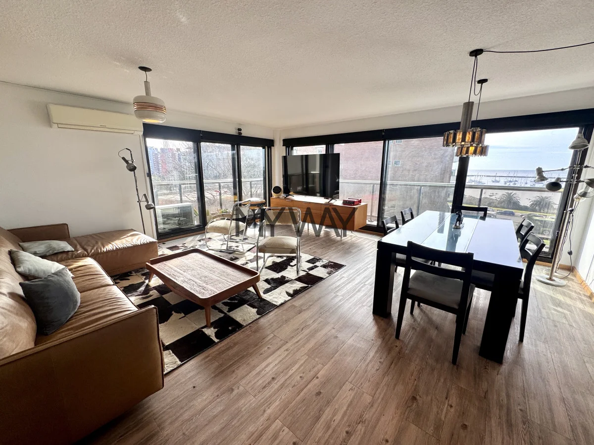 Amplio living comedor con vista hacia el Puertito del Buceo con salida a balcón a lo largo de todo el living.