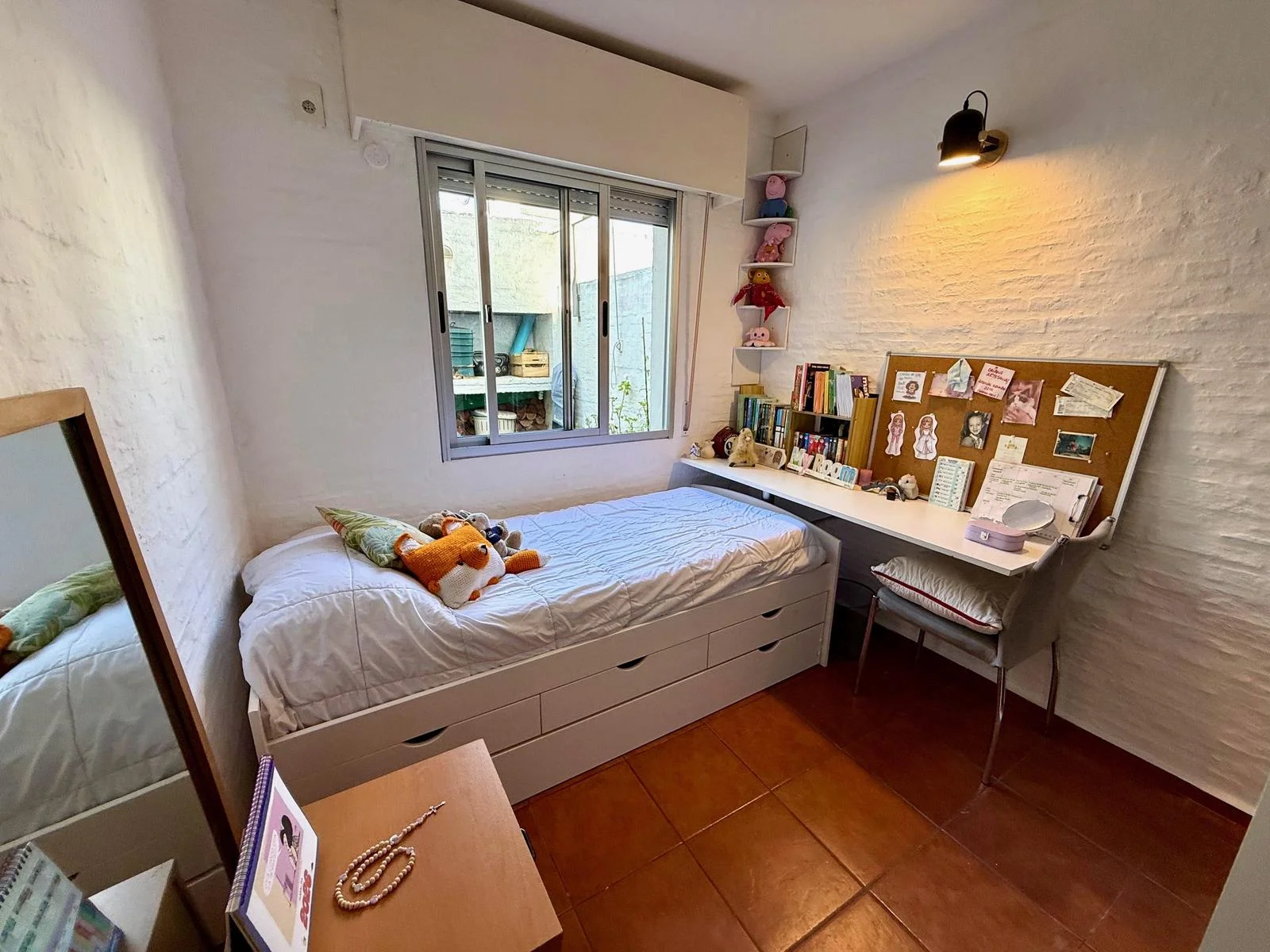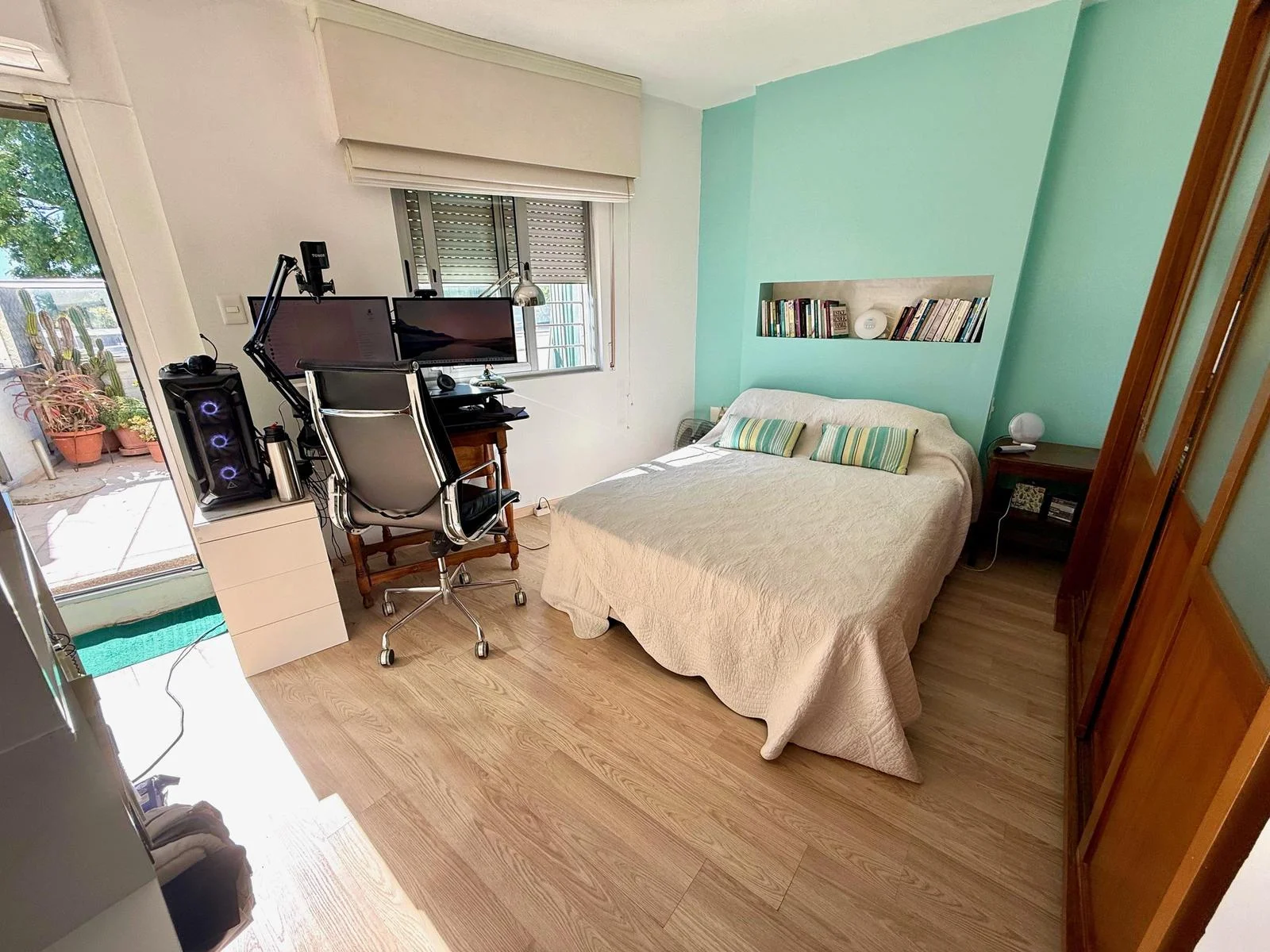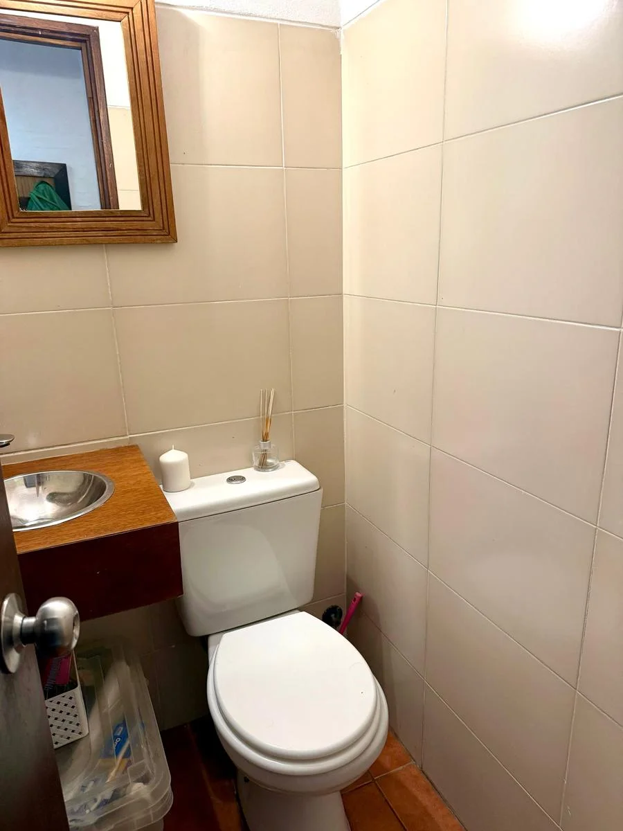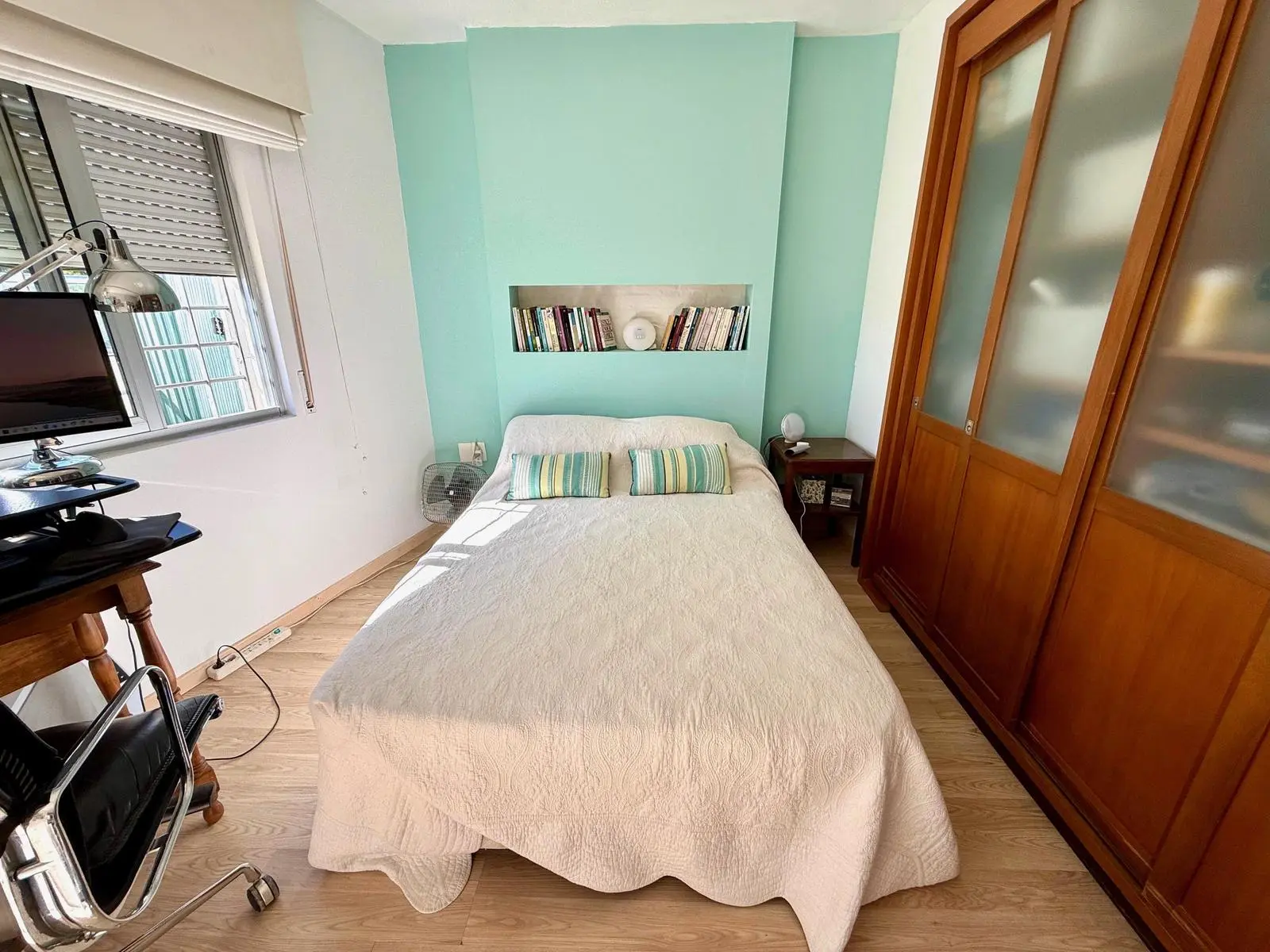 Cocina cuadrada con buena iluminación natural y buen espacio de guardado. Dormitorio en planta baja orientado al este, con vista al patio, con armarios y persiana.