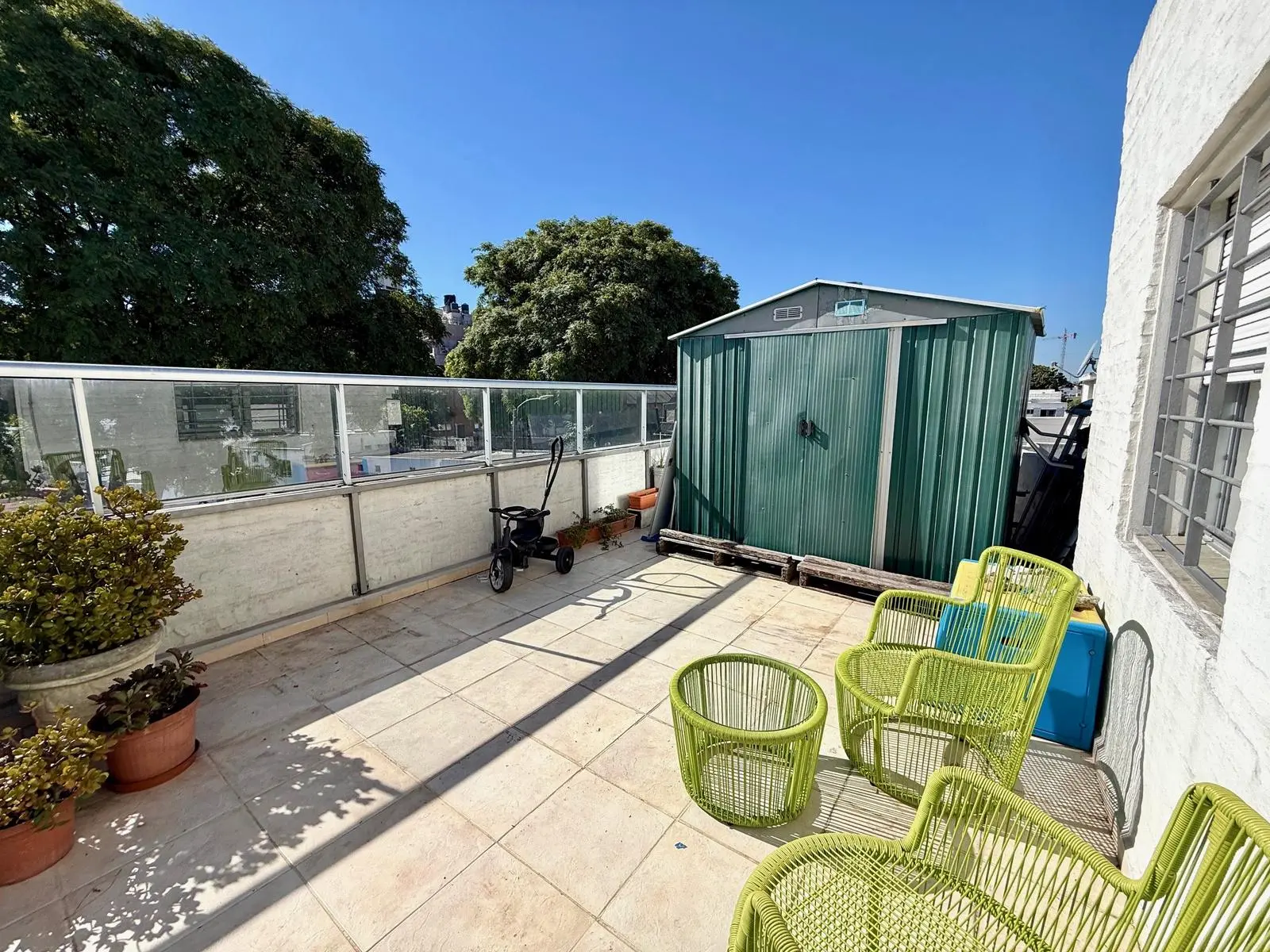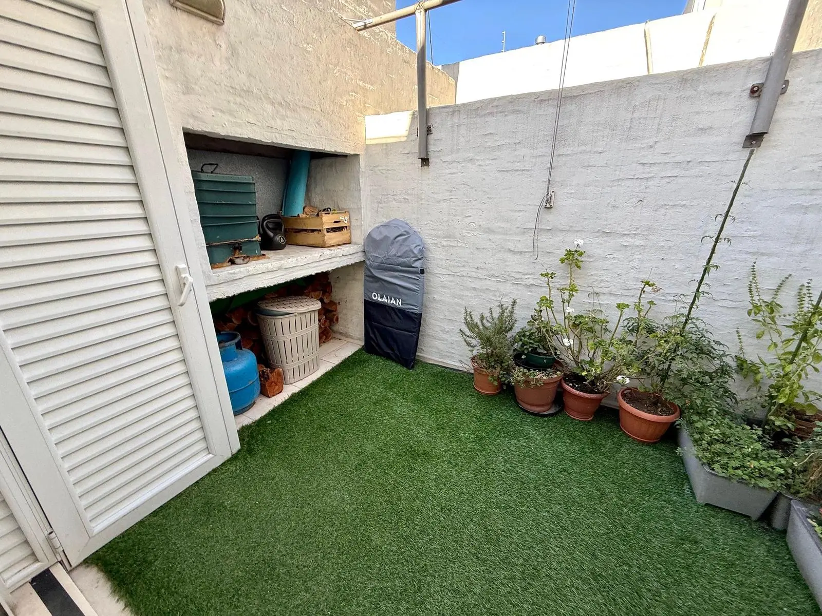 Salida a patio con parrillero muy fresco y con toldo, y con armario para lavarropas y secadoras en aluminio de calidad.