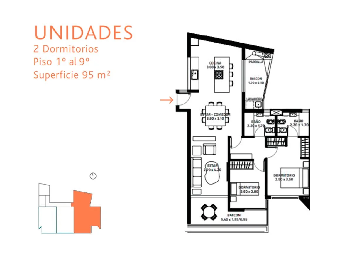 Luminoso apartamento, con diseño moderno, terminaciones y materiales de calidad. Estar comedor con salida a balcón al frente. Cocina integrada con salida a balcón lateral con parrillero. 2 dormitorios, 1 en suite y 2do baño completo.