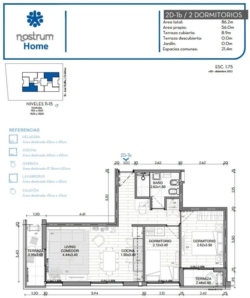 Se proyecta en 15 niveles, con 148 unidades de apartamentos, 128 de 1 dormitorio y 20 de 2 dormitorios.